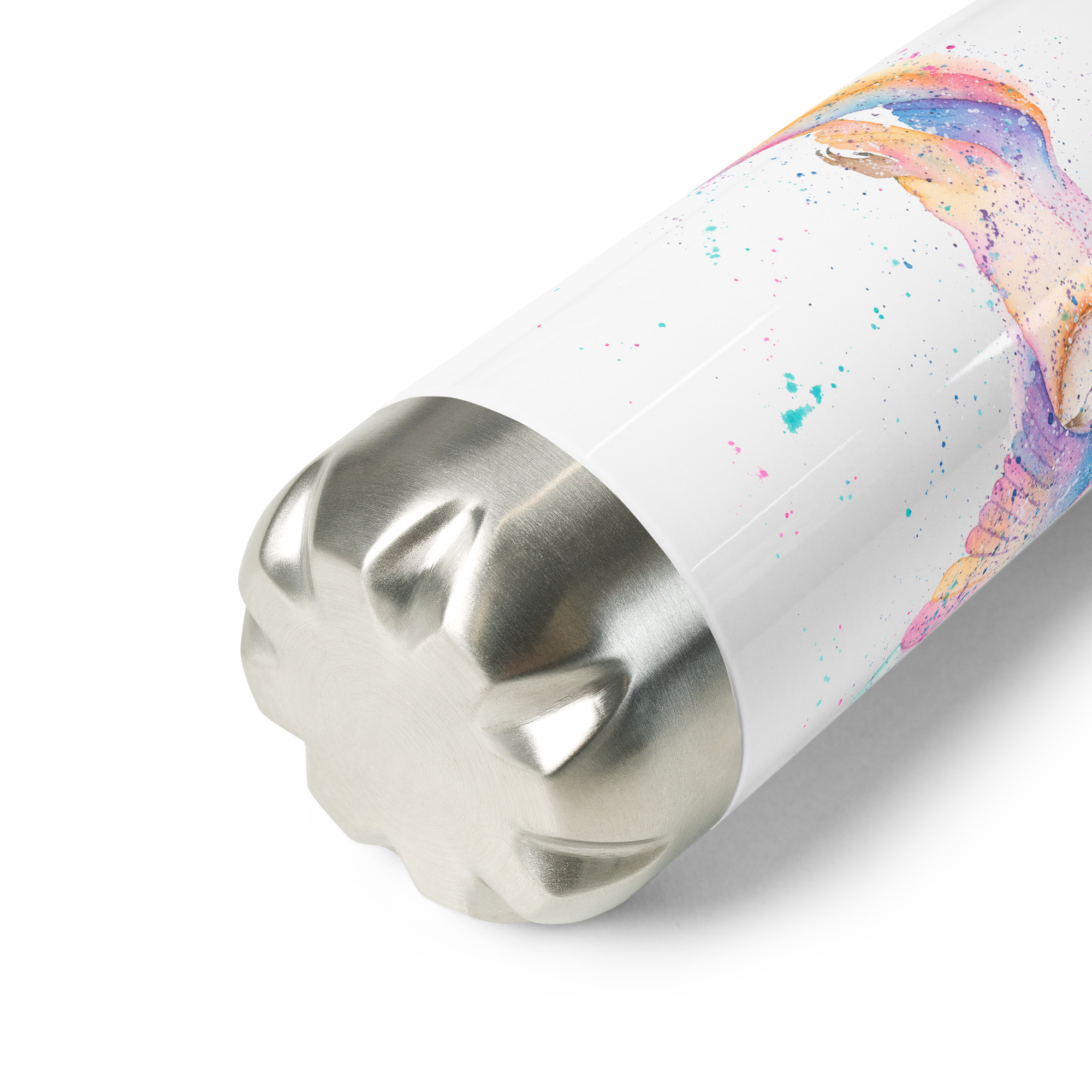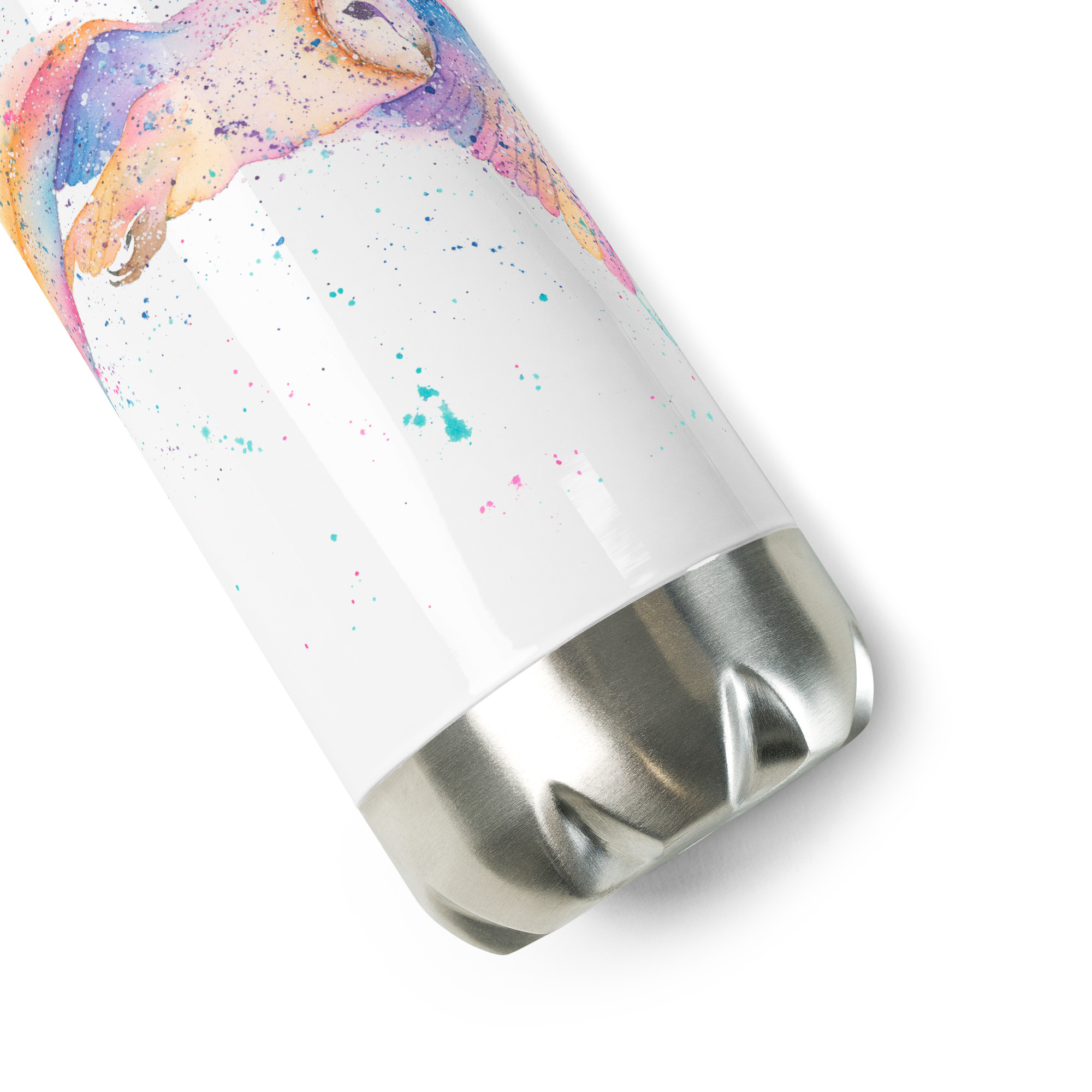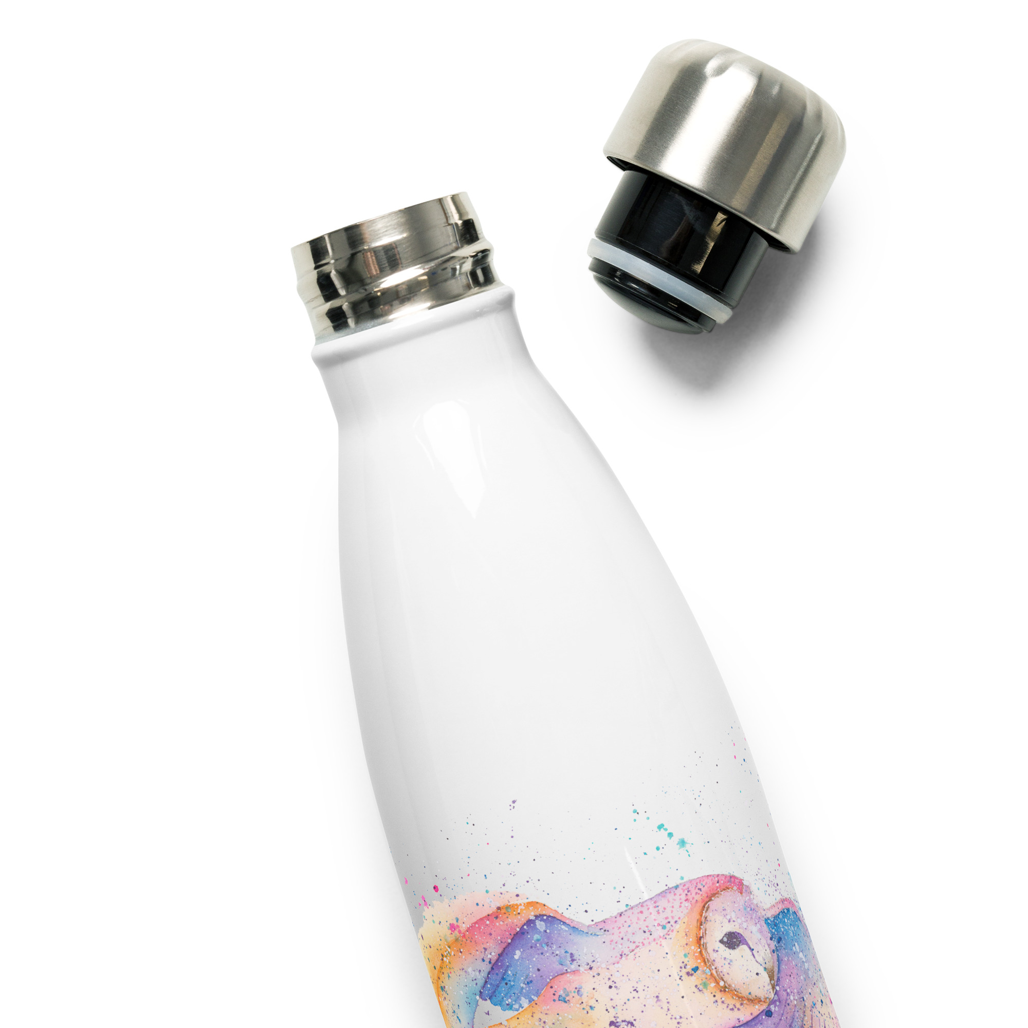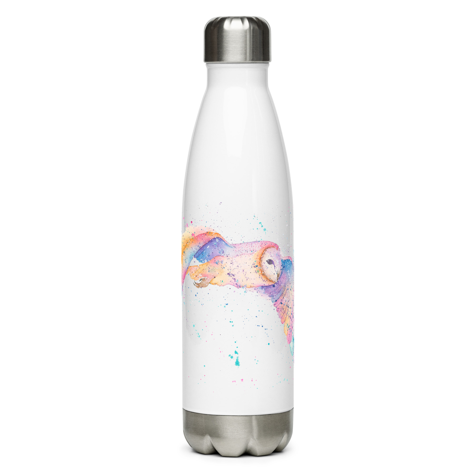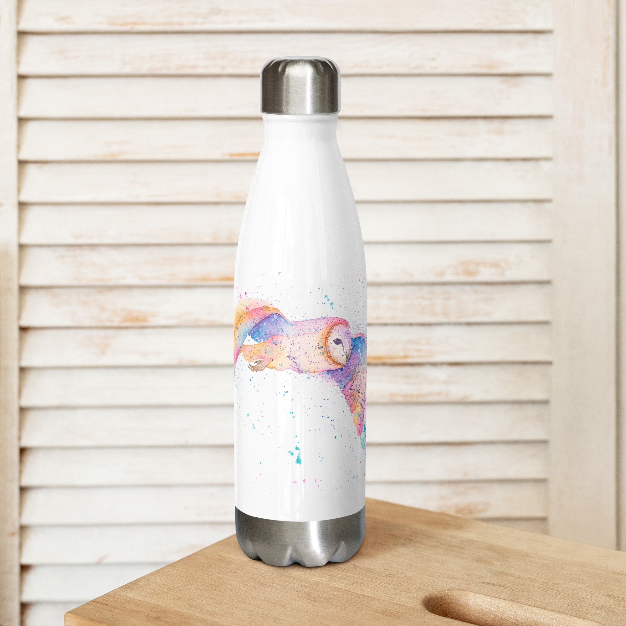 Elegant stainless steel water bottle featuring a hand-painted watercolour Barn OwlBarn Owl water bottle
