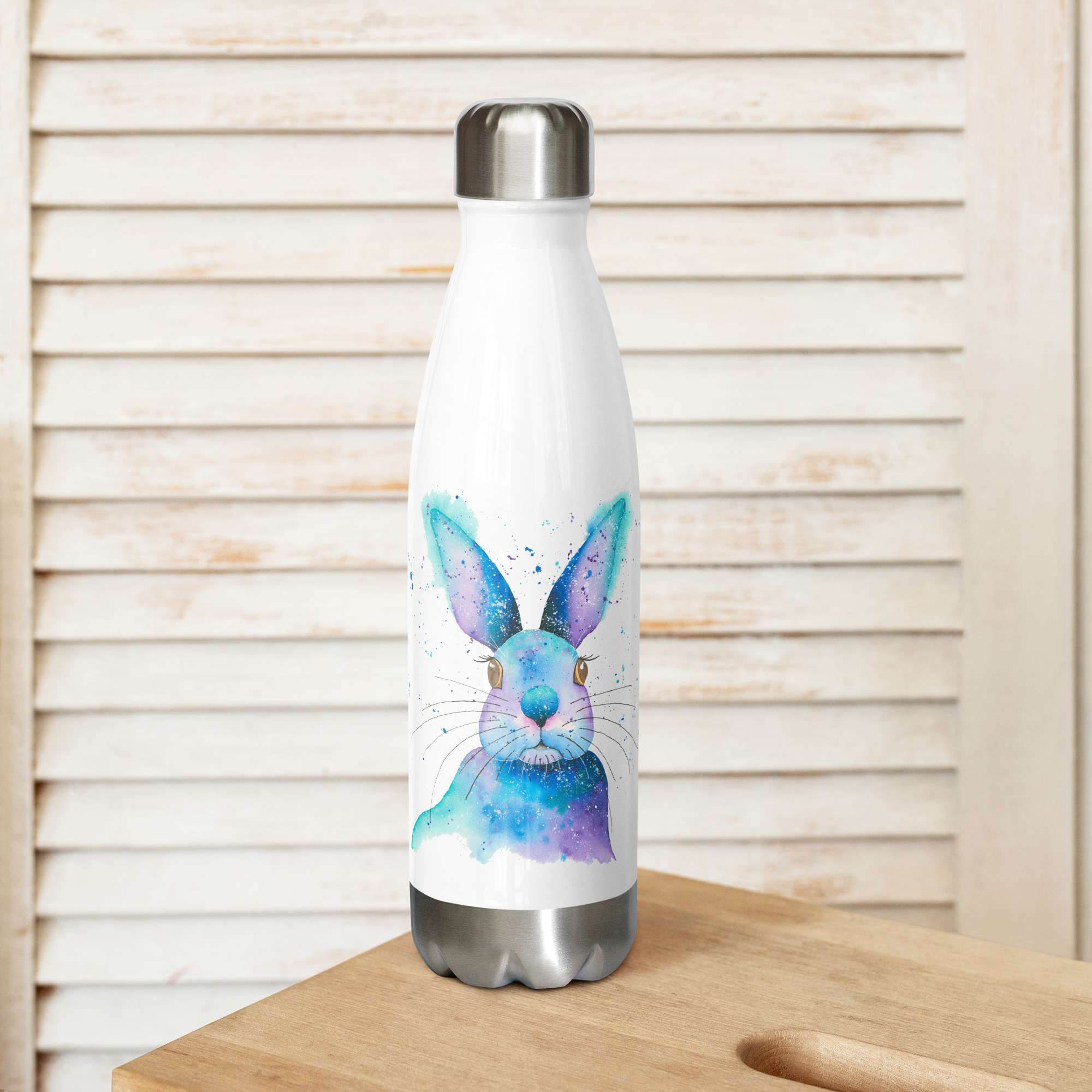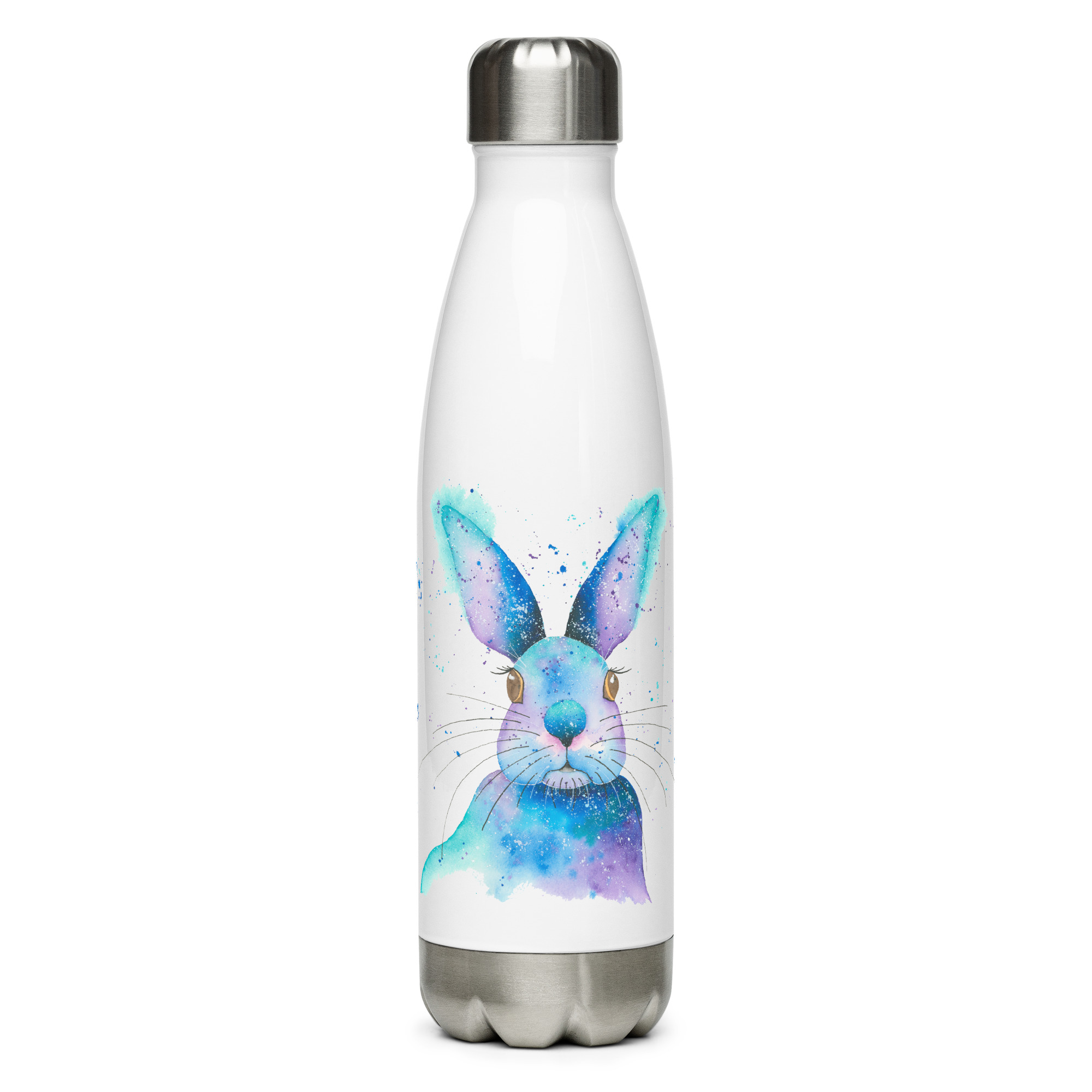 Whimsical stainless steel water bottle featuring a soft blue watercolour rabbit with long earsBlue Rabbit water bottle