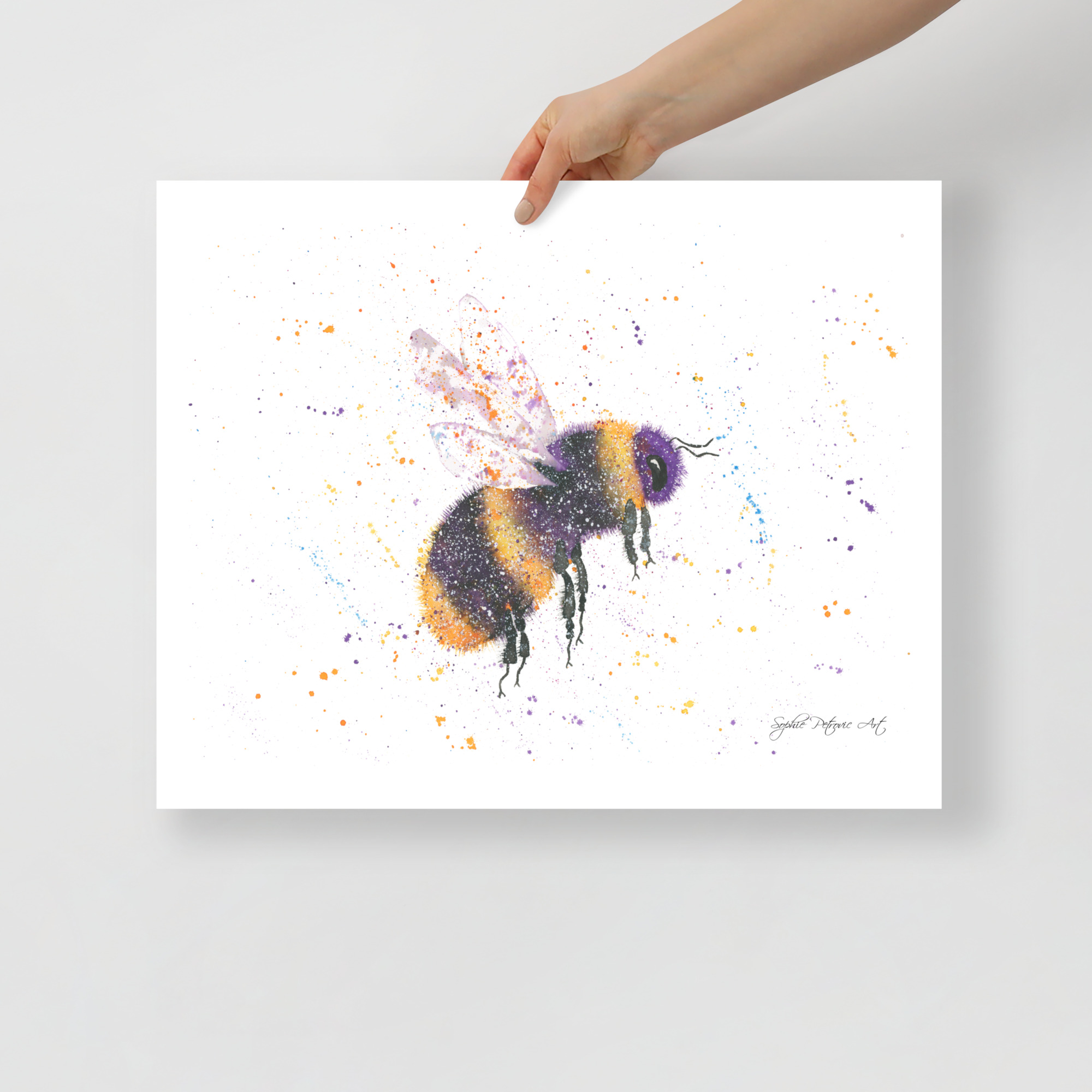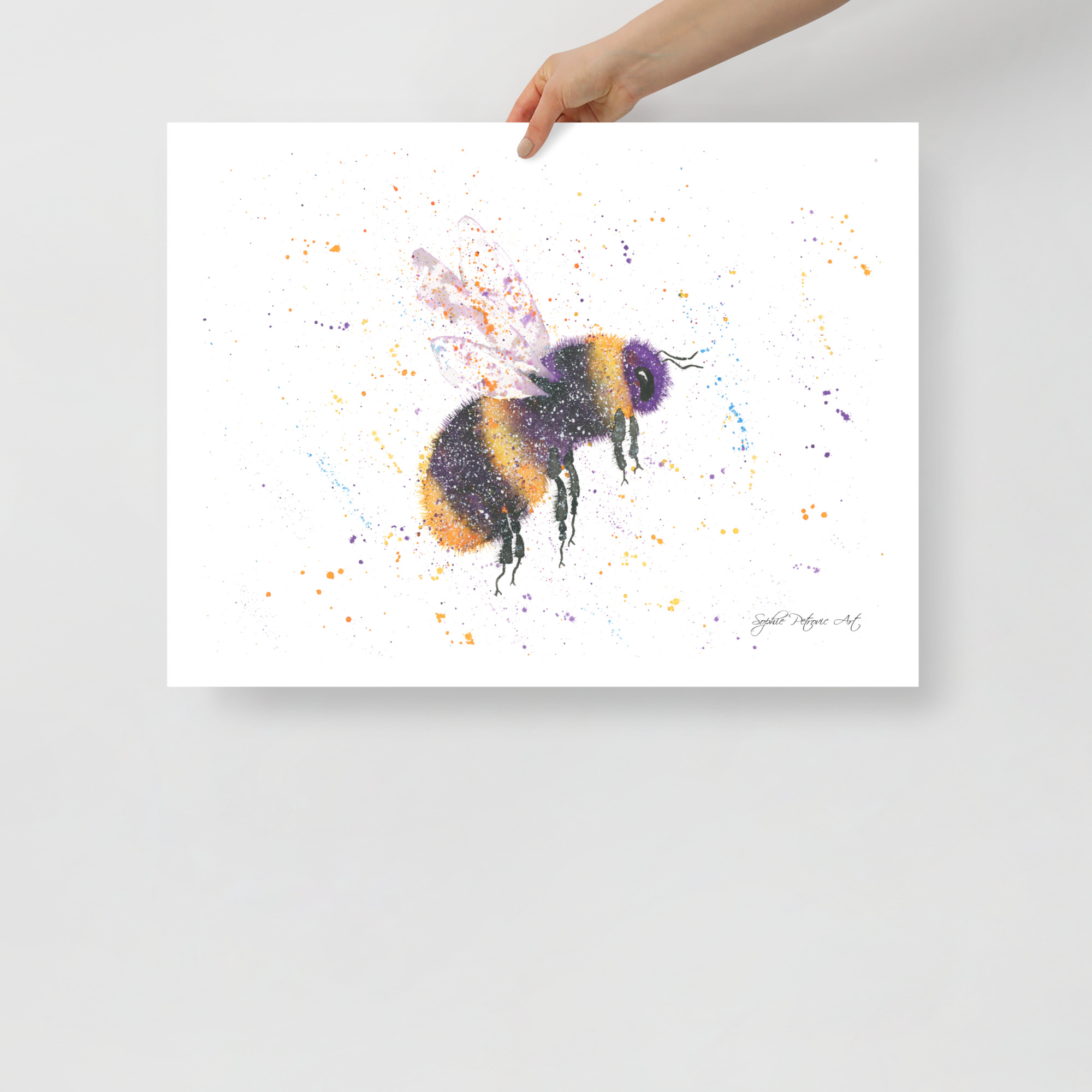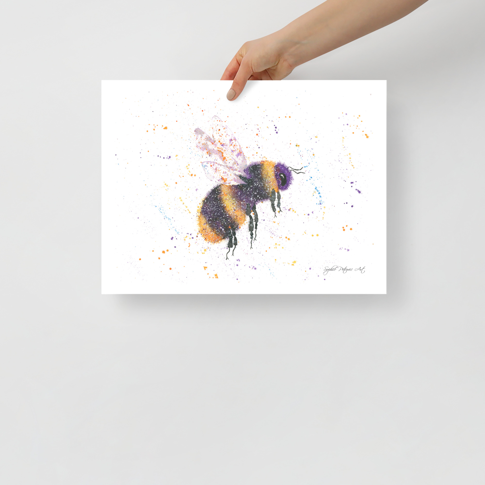 High-quality bumblebee wall art on textured paper, showcasing the delicate watercolour 'fuzz' and translucent wing detail of Bonnie the BeeBonnie The Bee Art Print