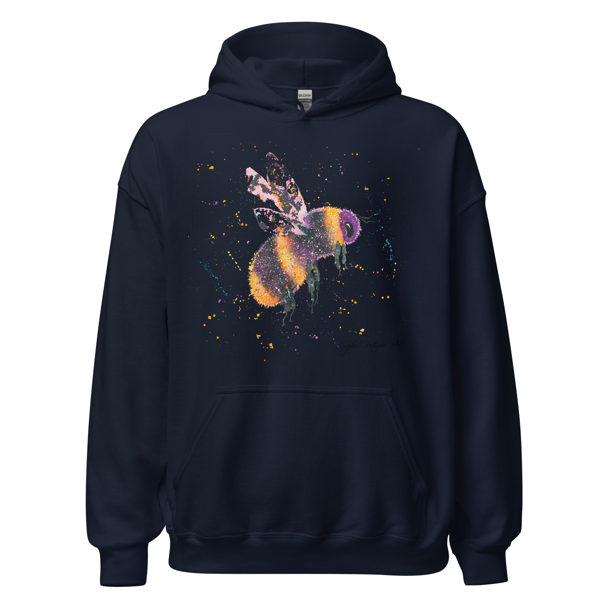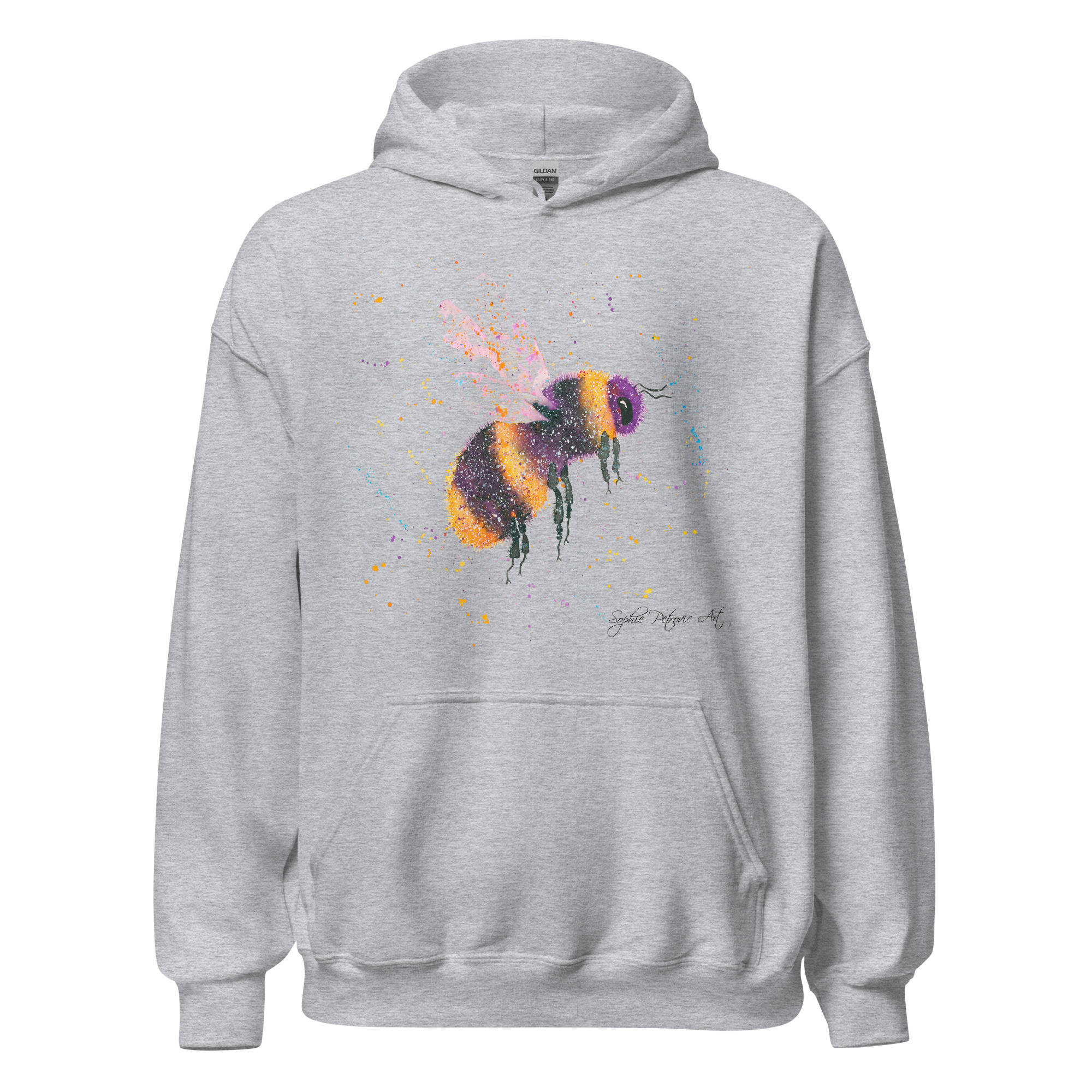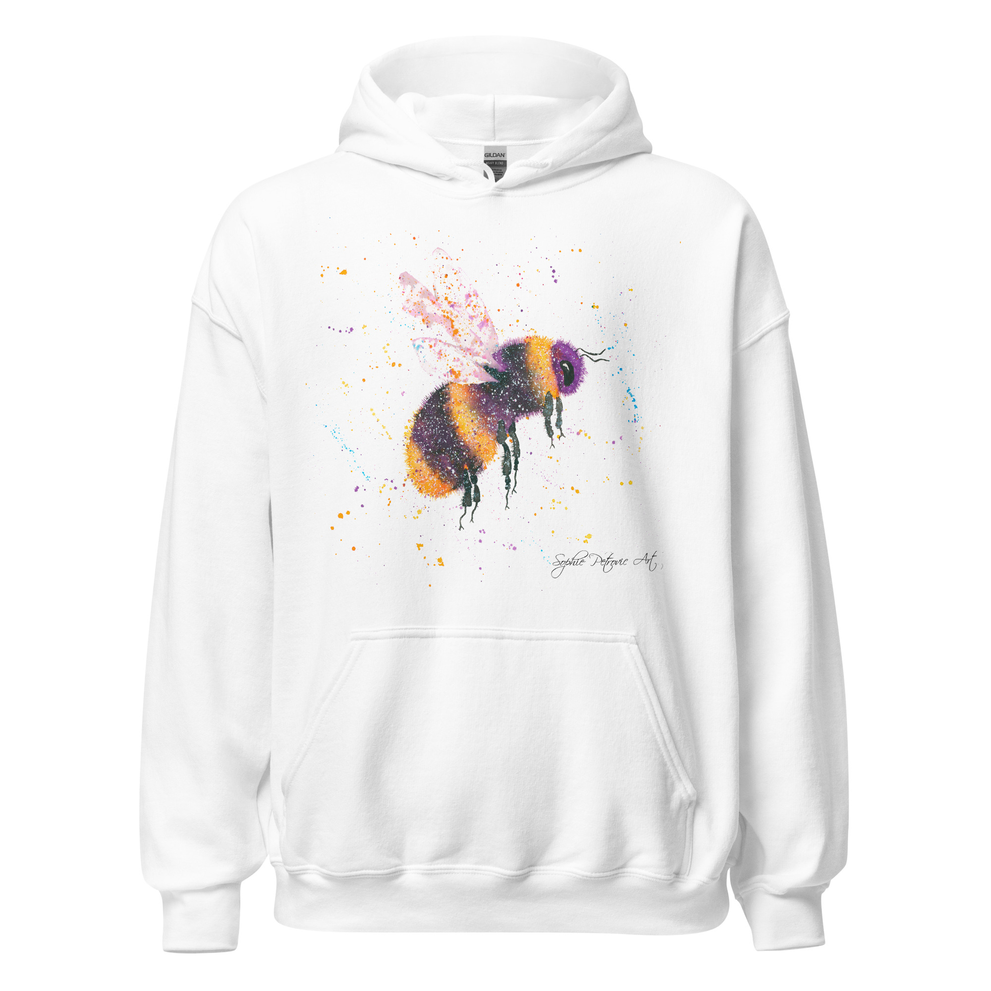 Adults' unisex bumblebee hoodie featuring Bonnie the Bee, a vibrant watercolour design with a front pouch pocket by sophie petrovic artBonnie The Bee Hoodie