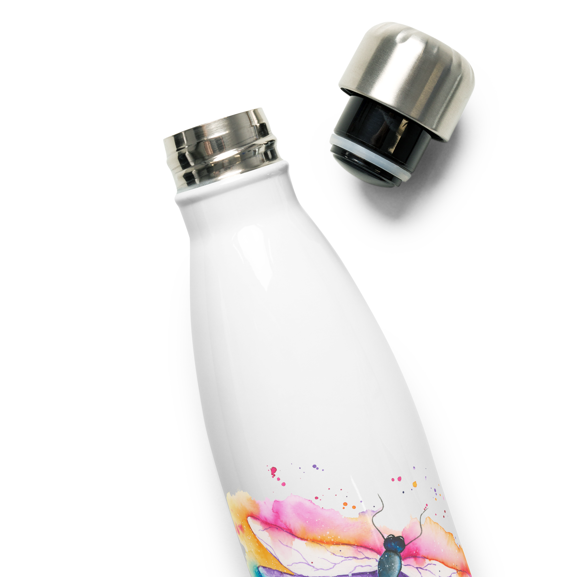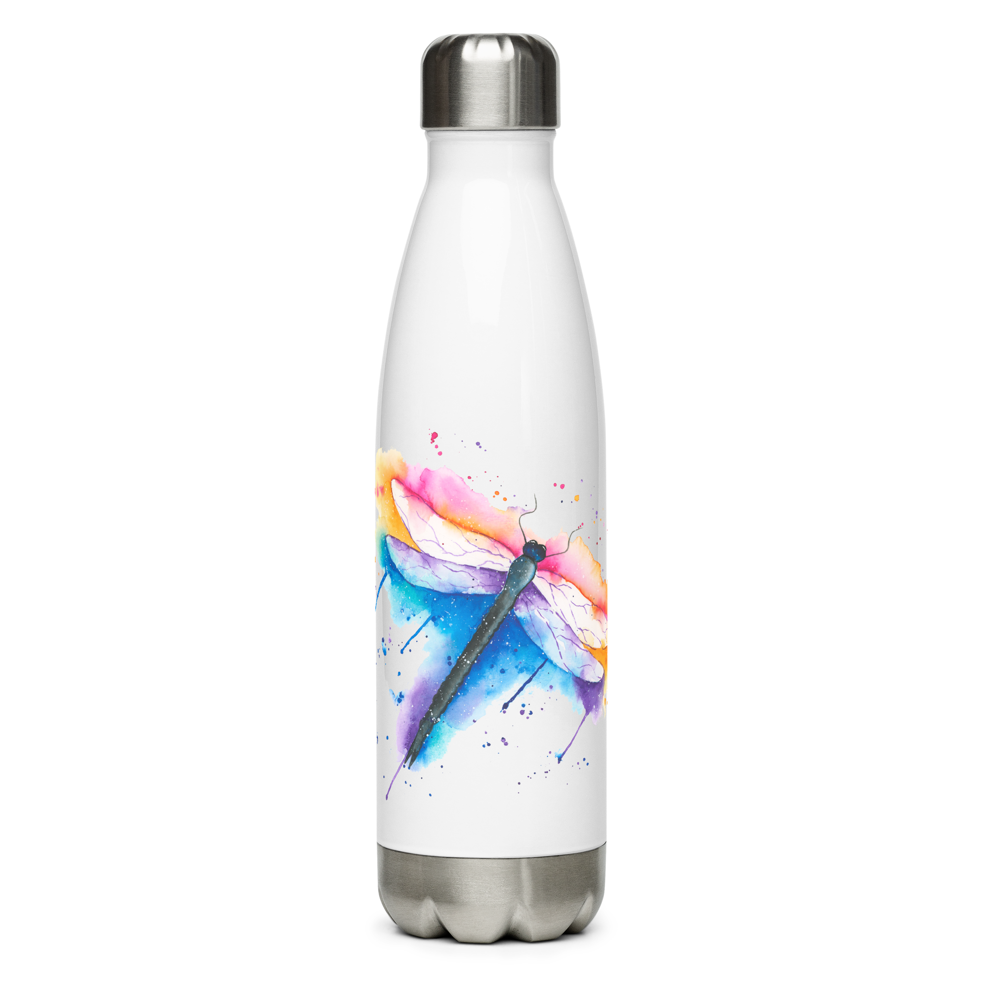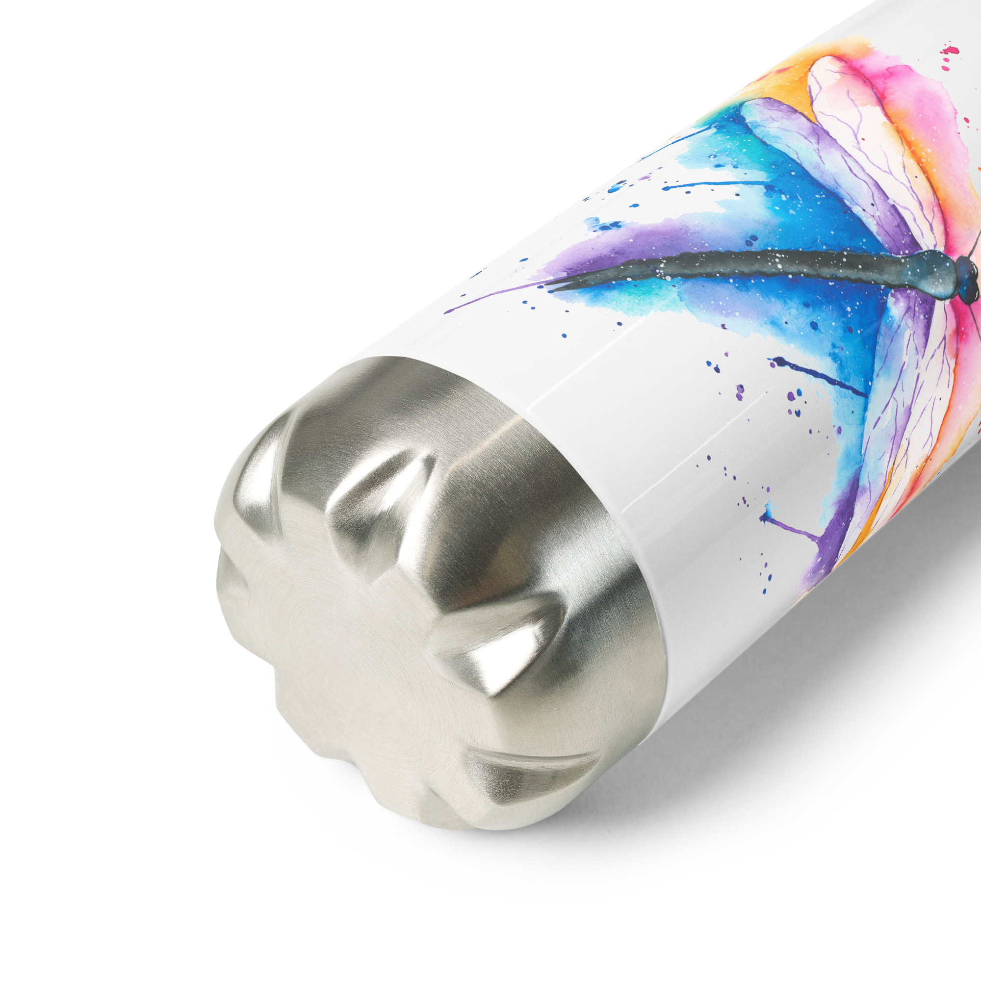 Elegant stainless steel water bottle featuring a hand-painted watercolour dragonflyDragonfly water bottle