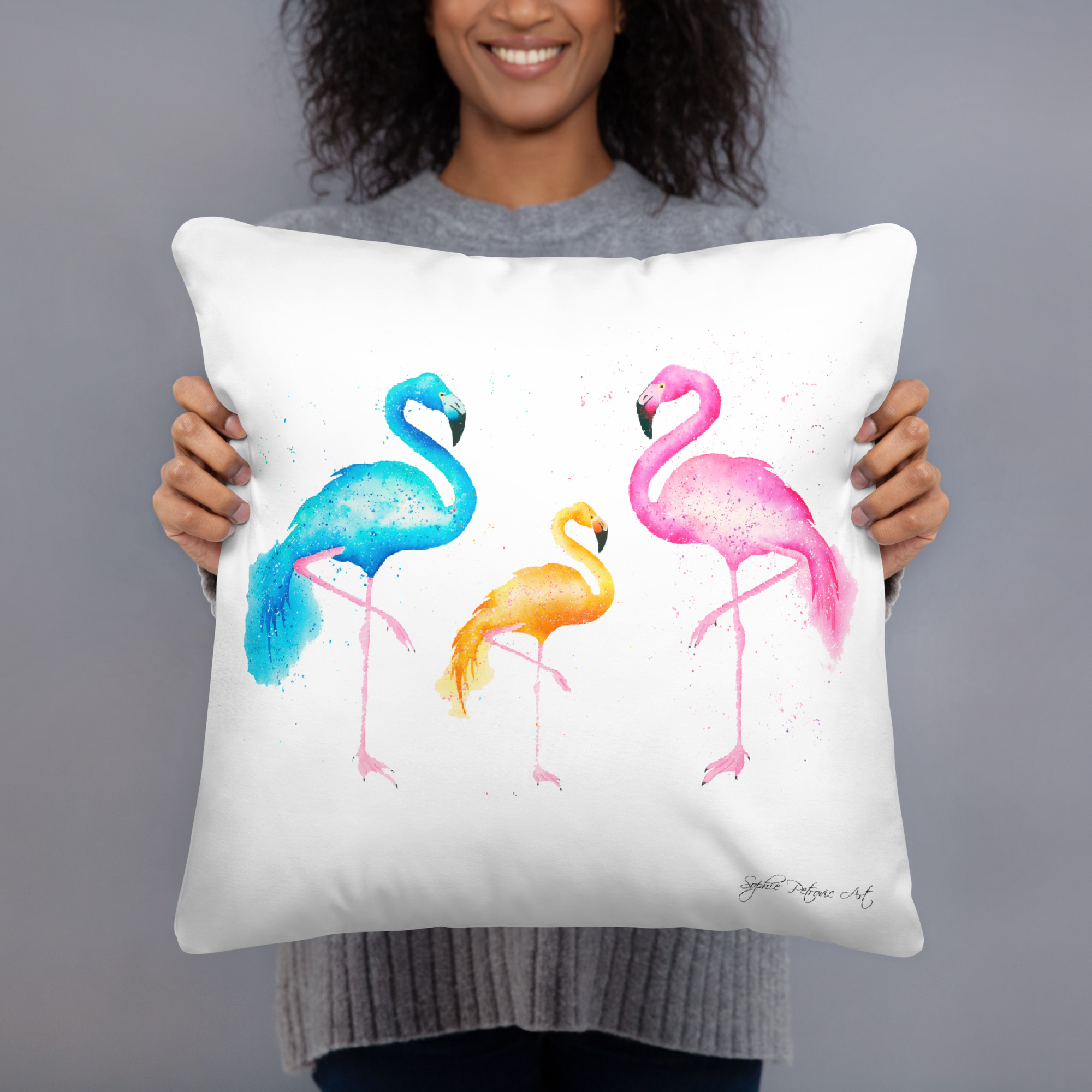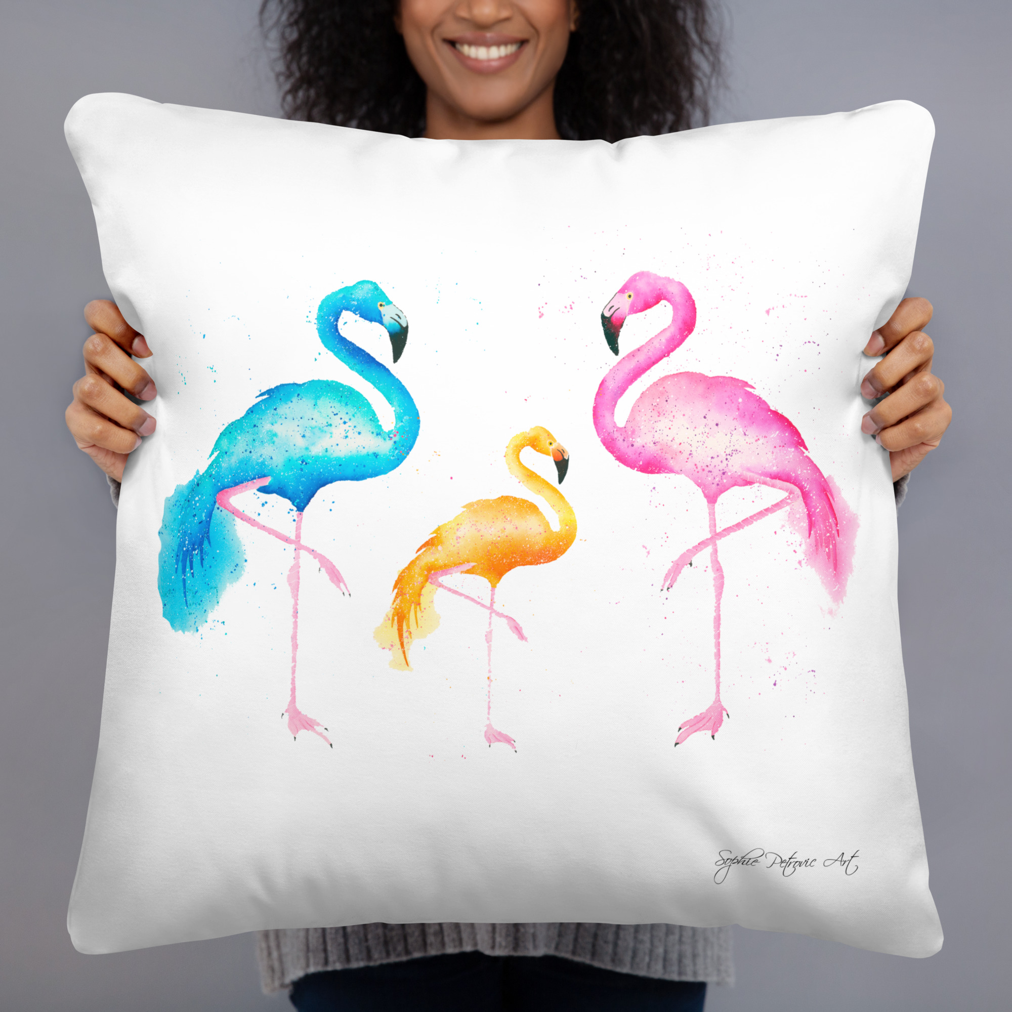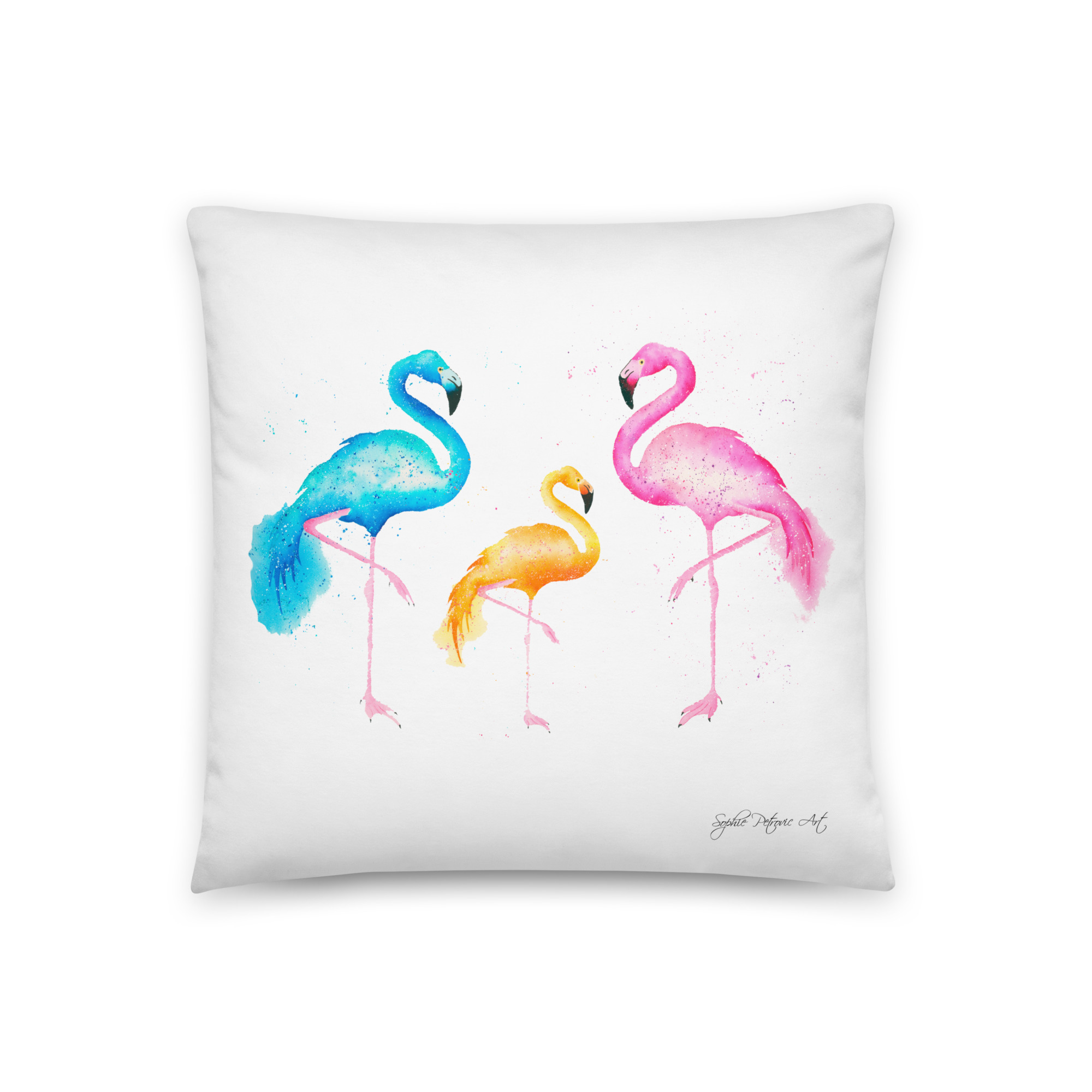 Hand painted watercolour flamingos illustration by Sophie PetrovicFlamingos Cushion