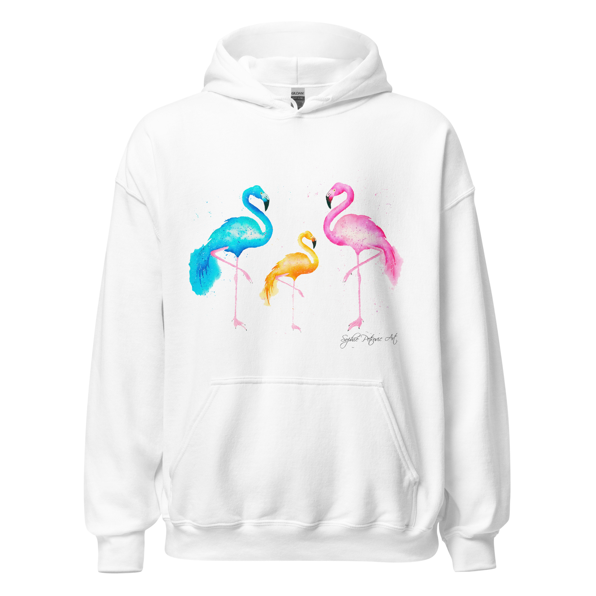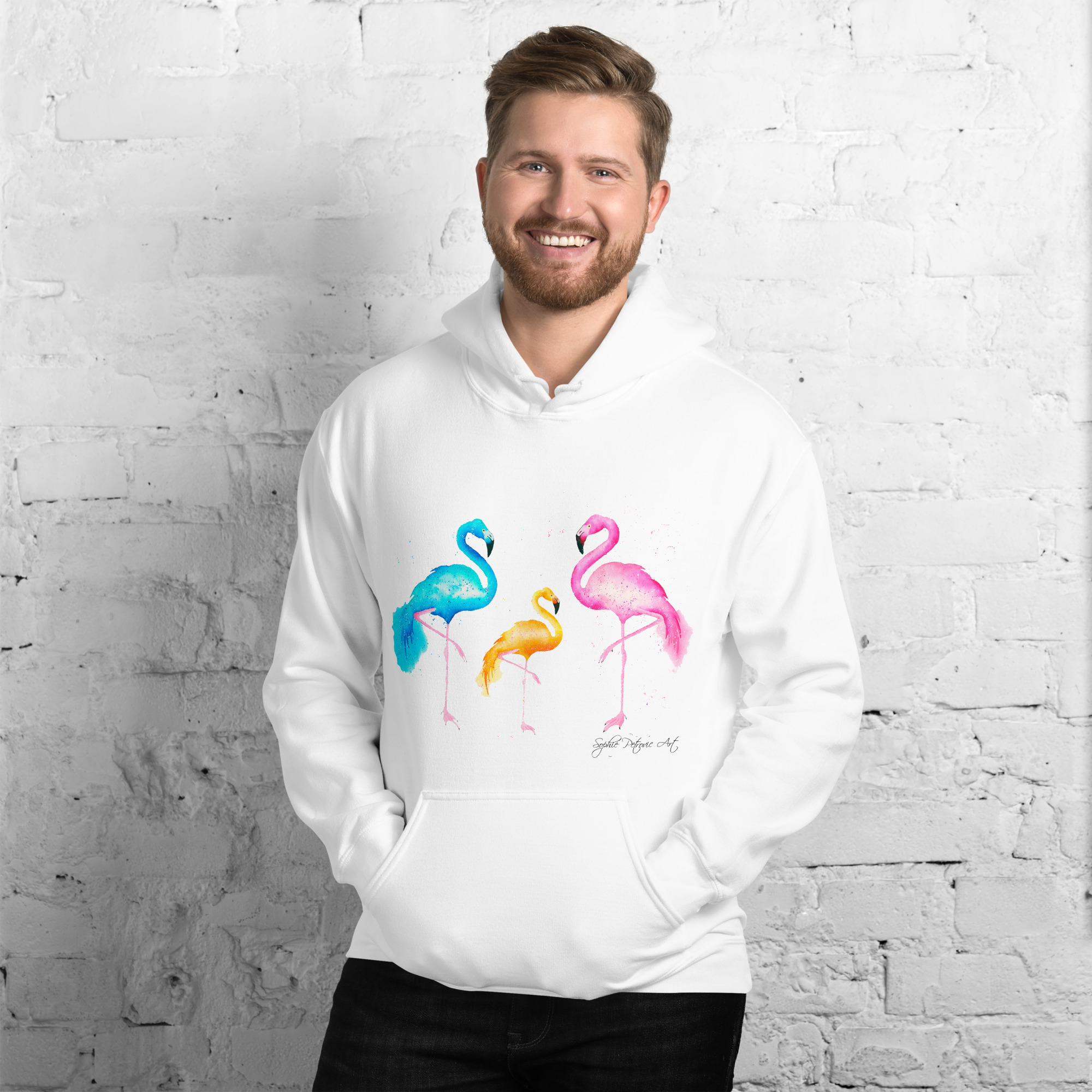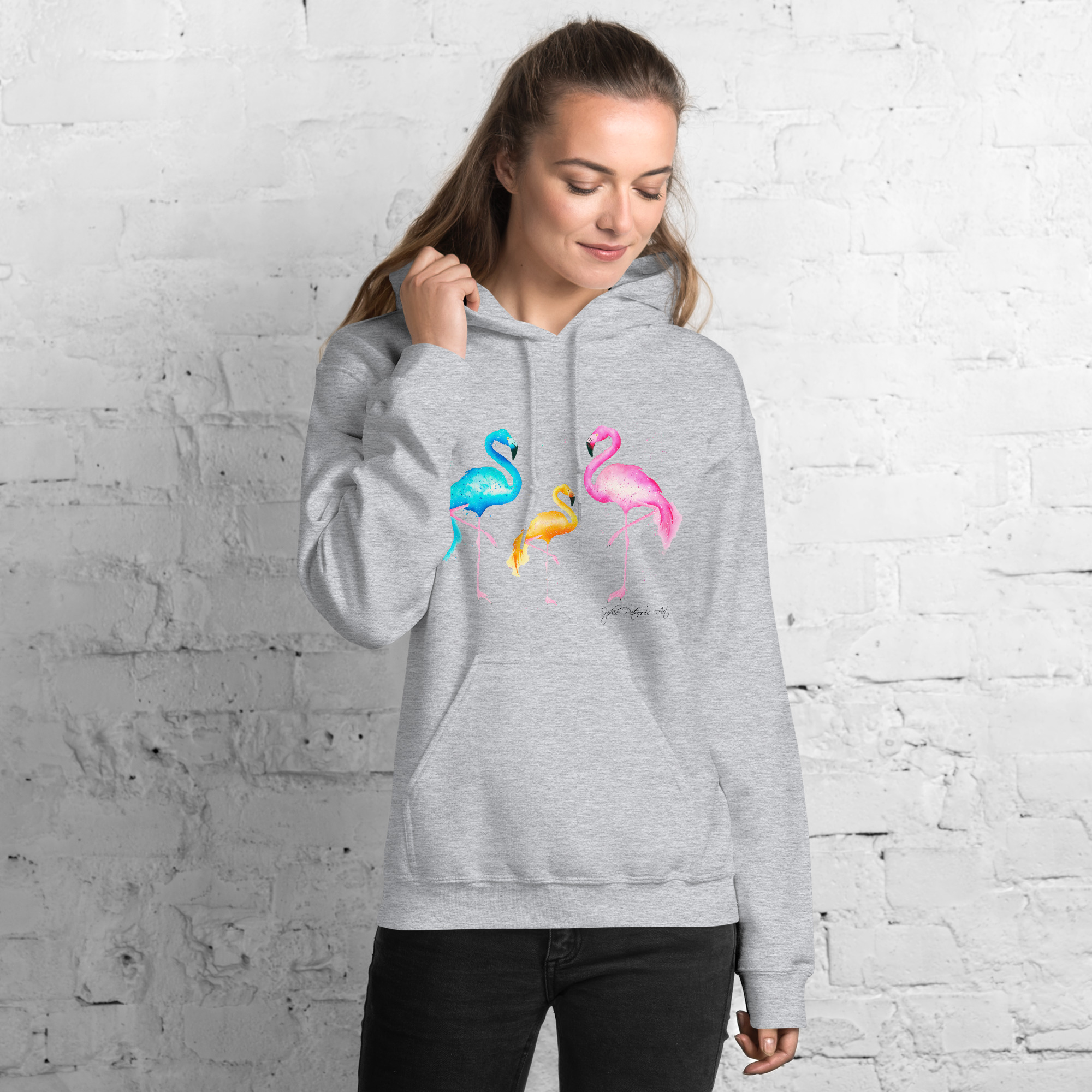 Everyone needs a cozy go to hoodie to curl up in, so go for one that’s soft, smooth, and stylish. Featuring the Flamingos from our watercolour collection, this hoodie brings a soft blend of natural grace and vibrant, colourful elegance to your wardrobe. It’s the perfect choice for cooler evenings, coastal walks, or simply relaxing at home.