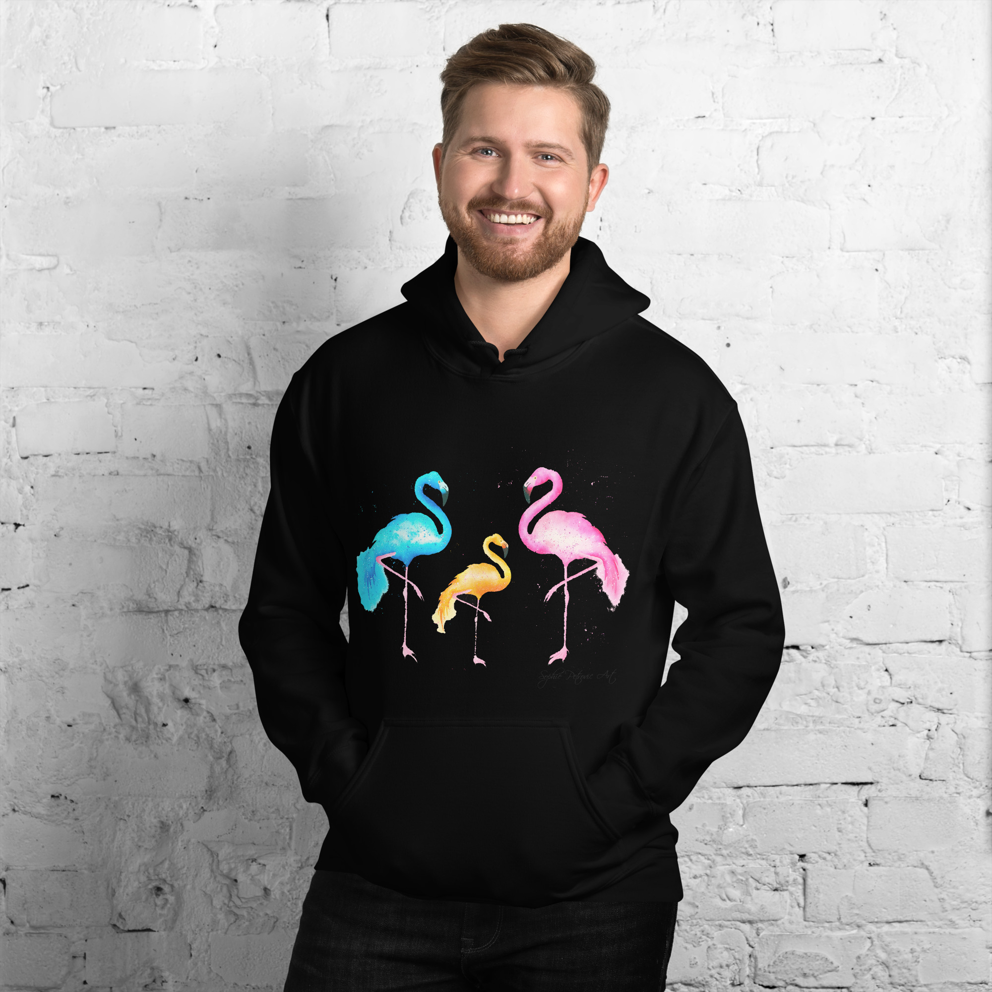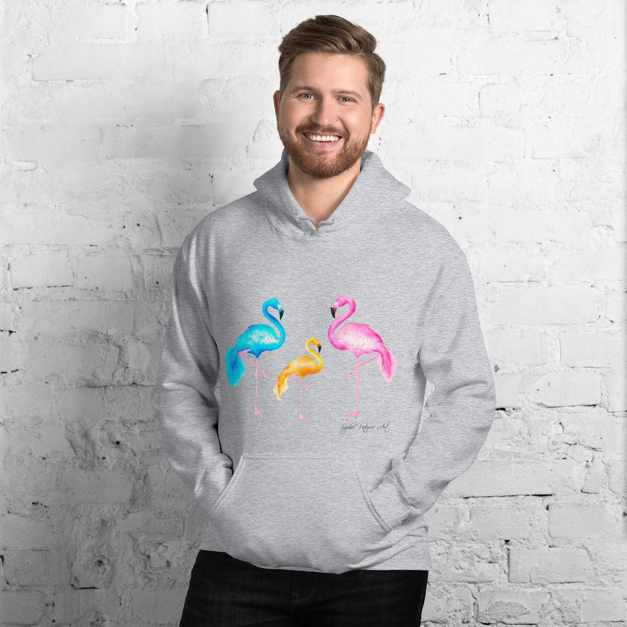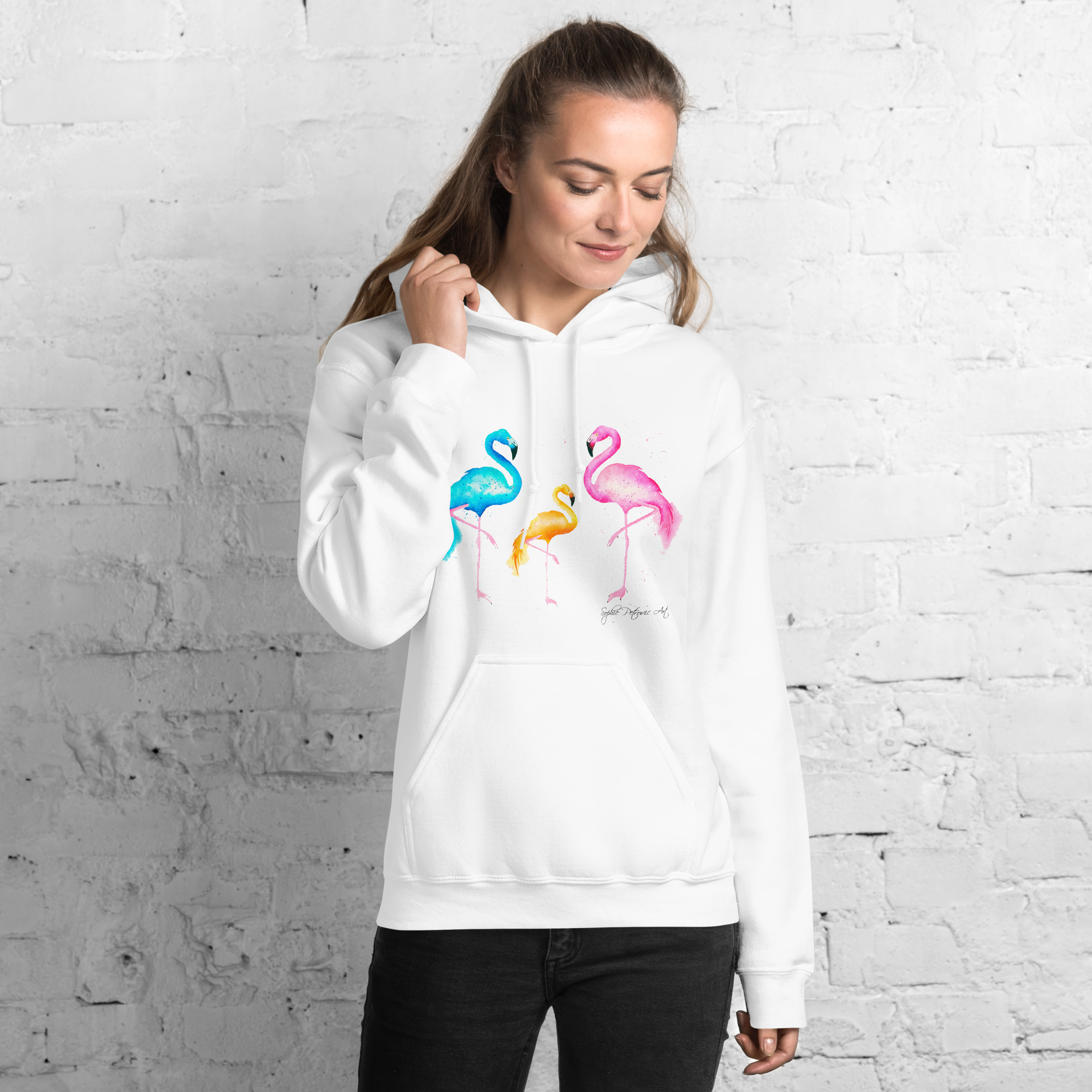Everyone needs a cozy go to hoodie to curl up in, so go for one that’s soft, smooth, and stylish. Featuring the Flamingos from our watercolour collection, this hoodie brings a soft blend of natural grace and vibrant, colourful elegance to your wardrobe. It’s the perfect choice for cooler evenings, coastal walks, or simply relaxing at home.
