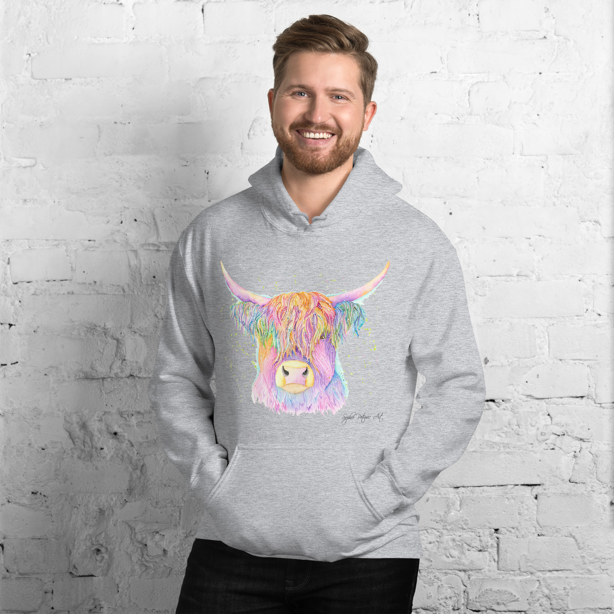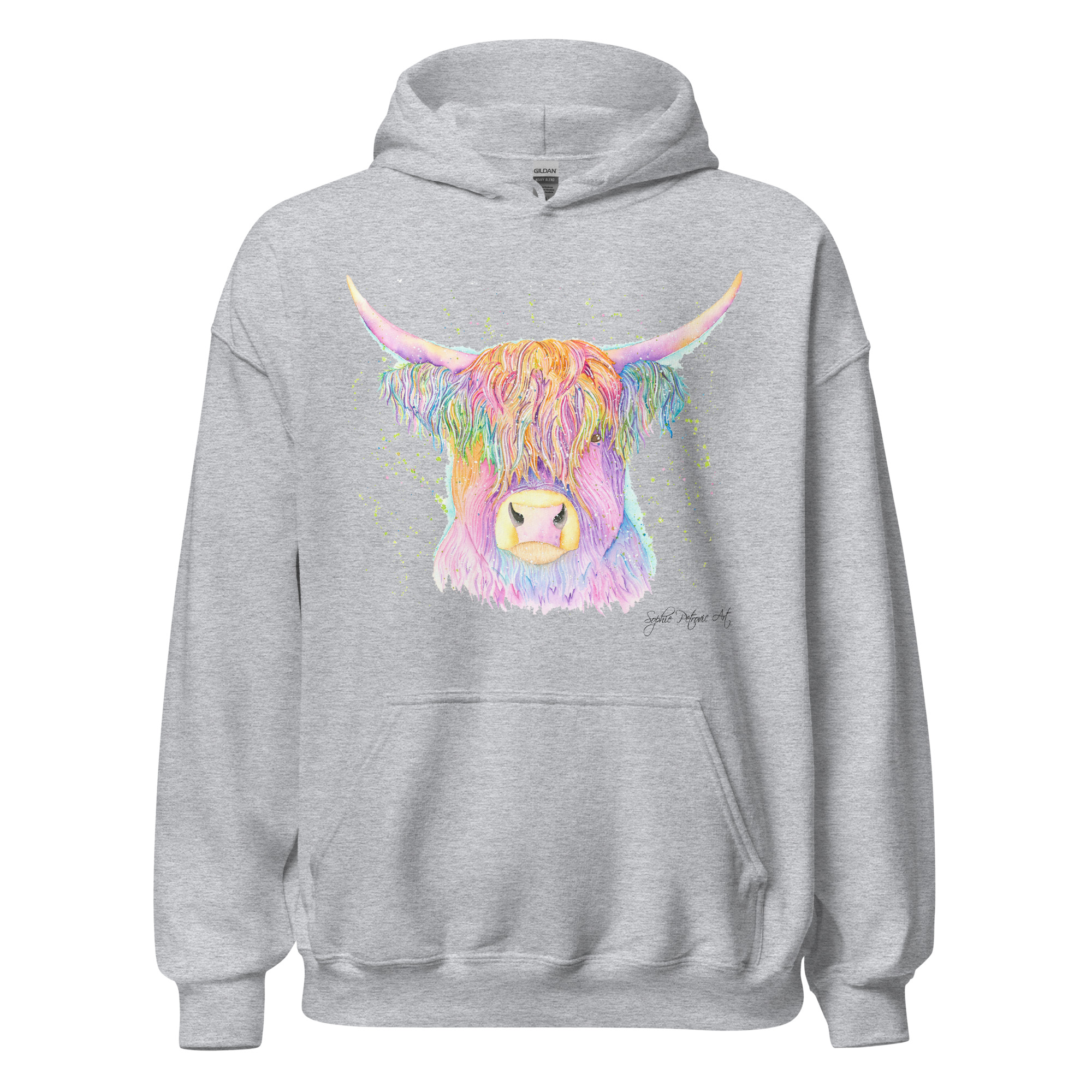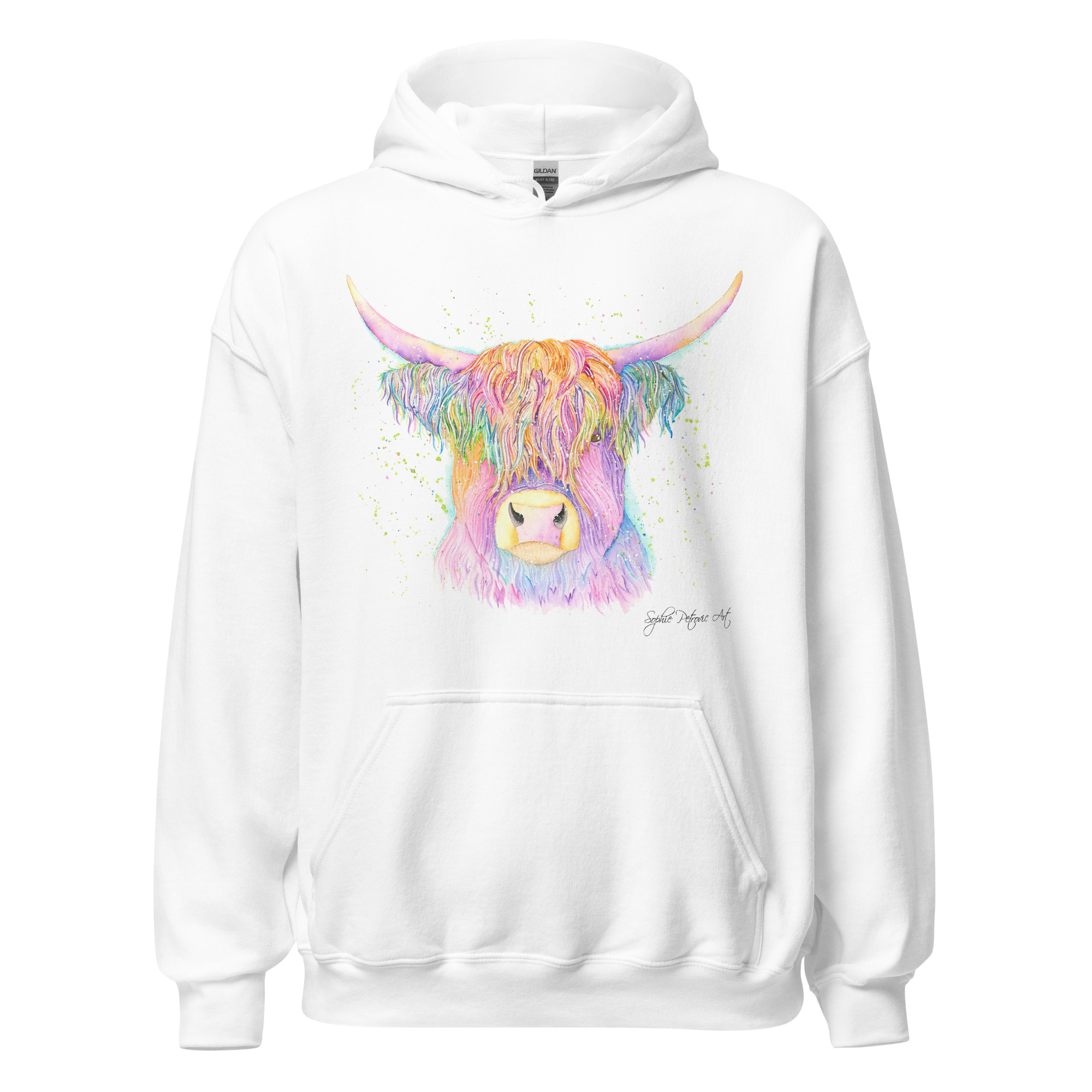 Adults' unisex Highland Cow hoodie featuring Hank, a vibrant watercolour design with a front pouch pocket by sophie petrovic artHank The Highland Cow Hoodie