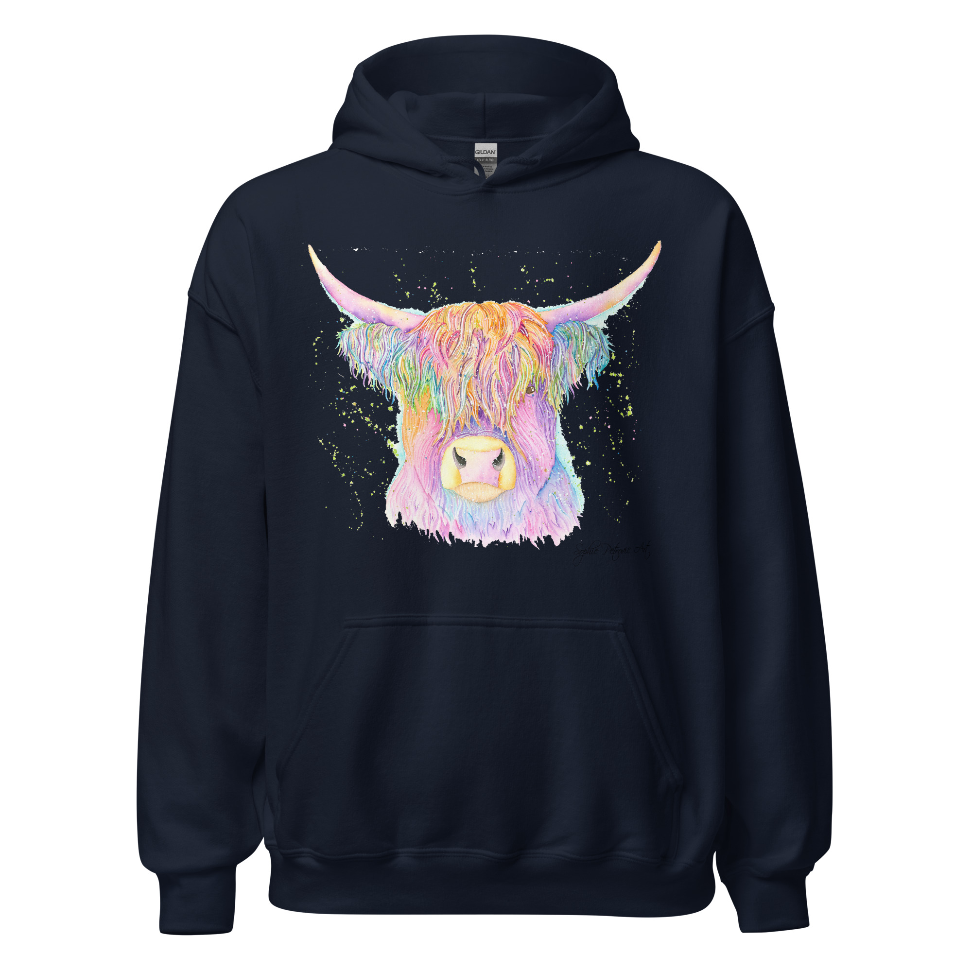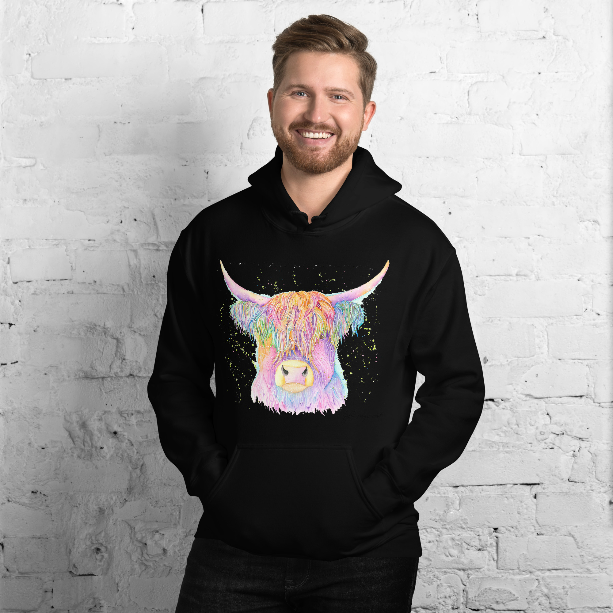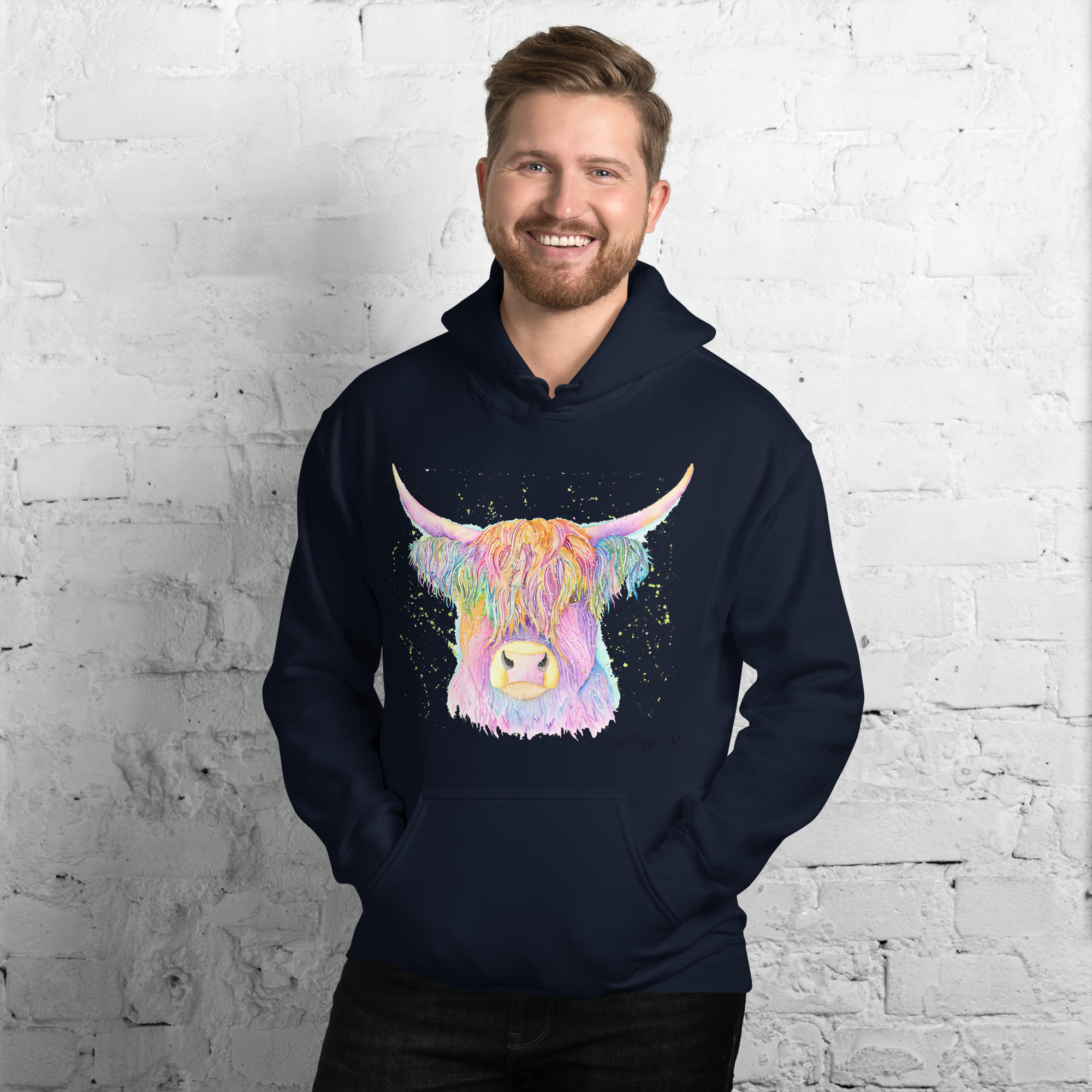Adults' unisex Highland Cow hoodie featuring Hank, a vibrant watercolour design with a front pouch pocket by sophie petrovic artHank The Highland Cow Hoodie