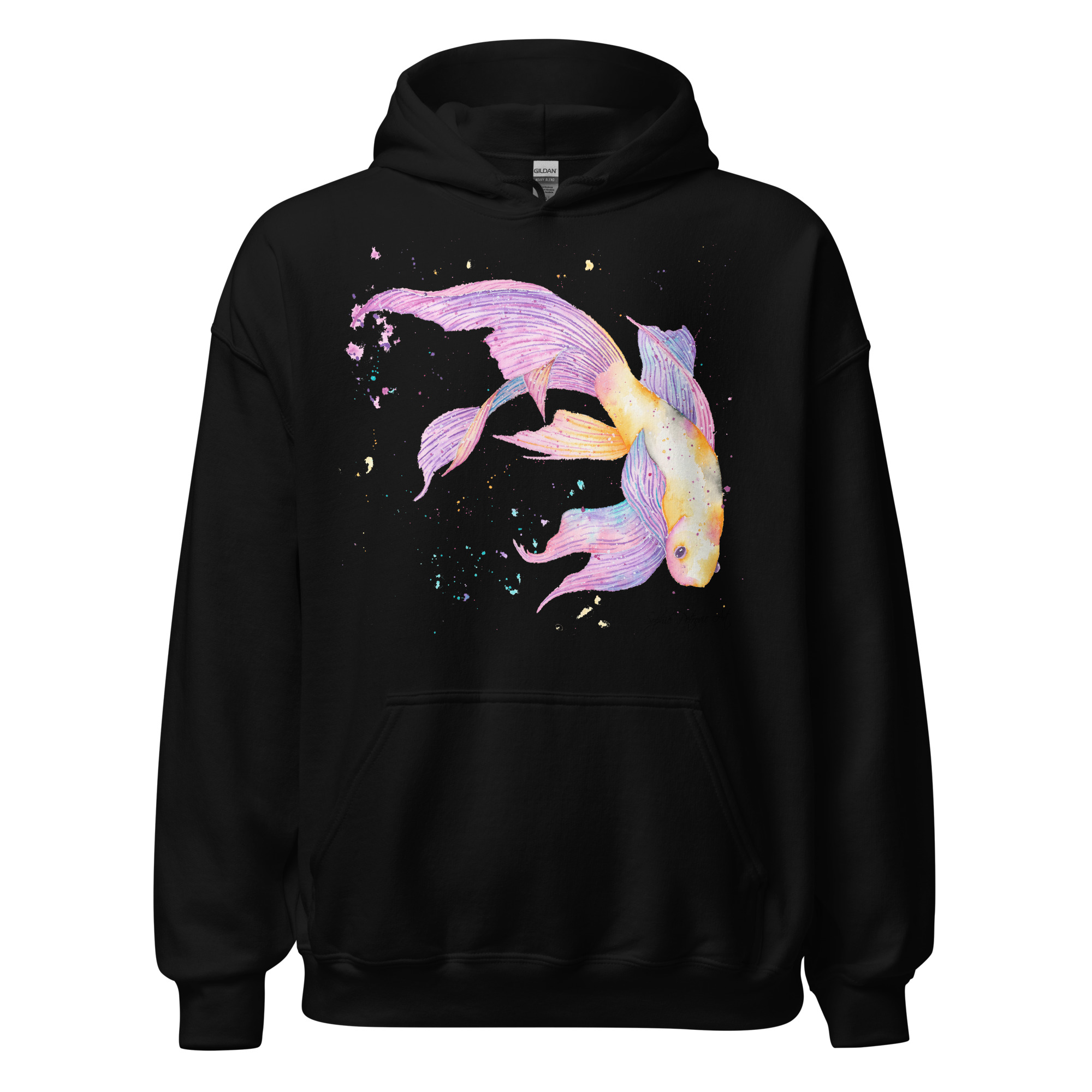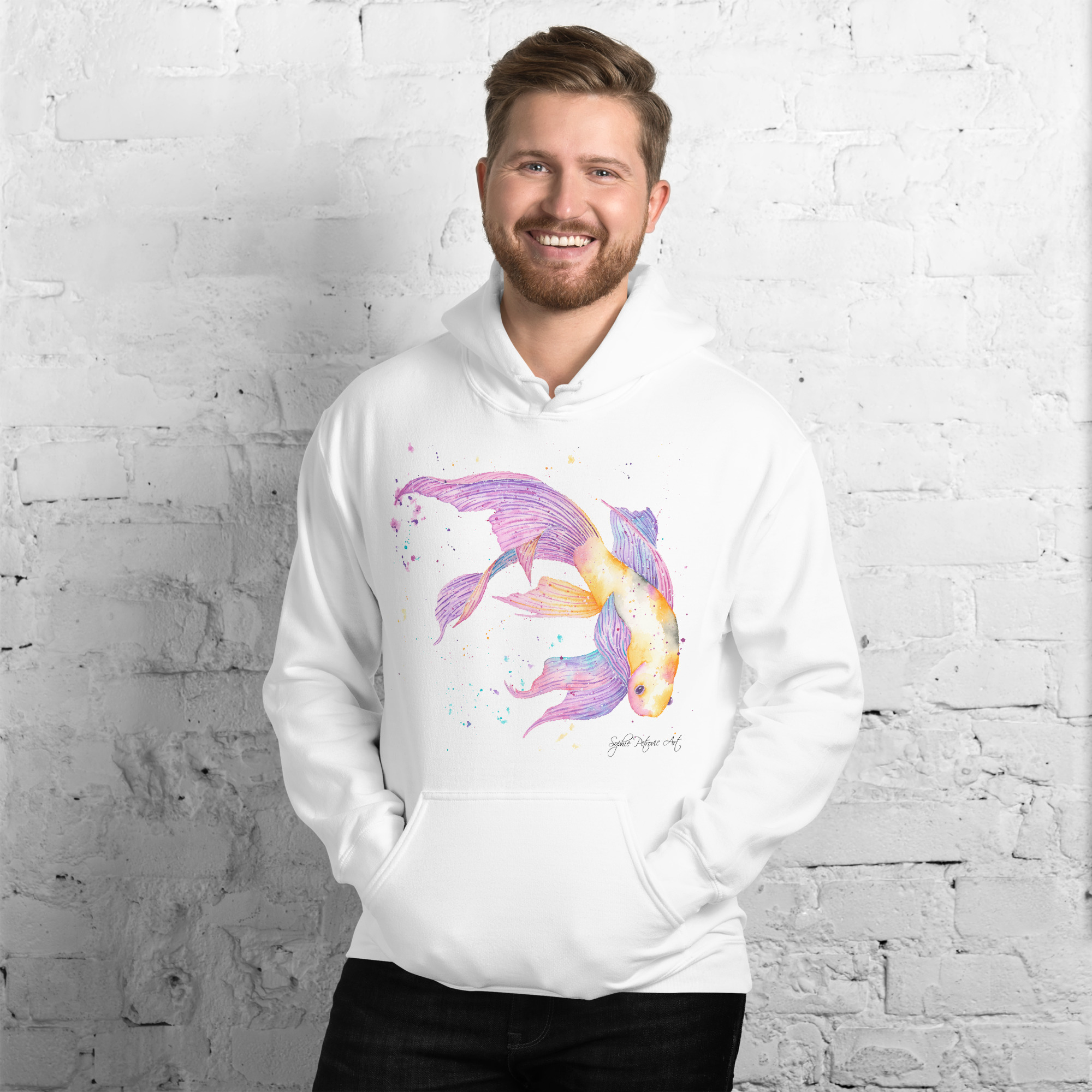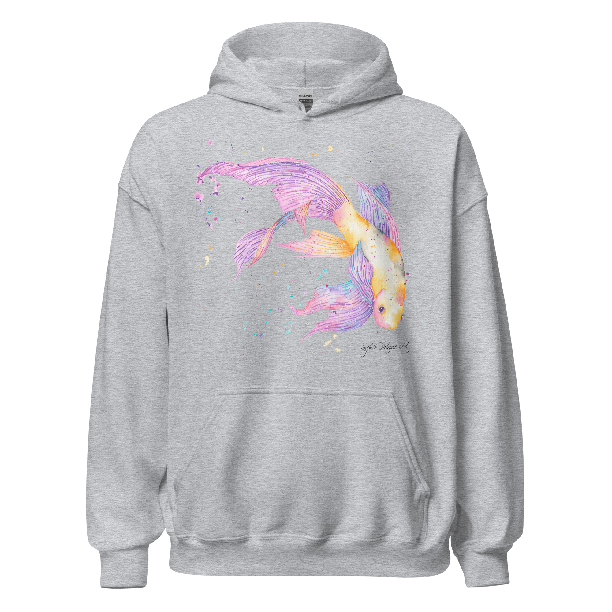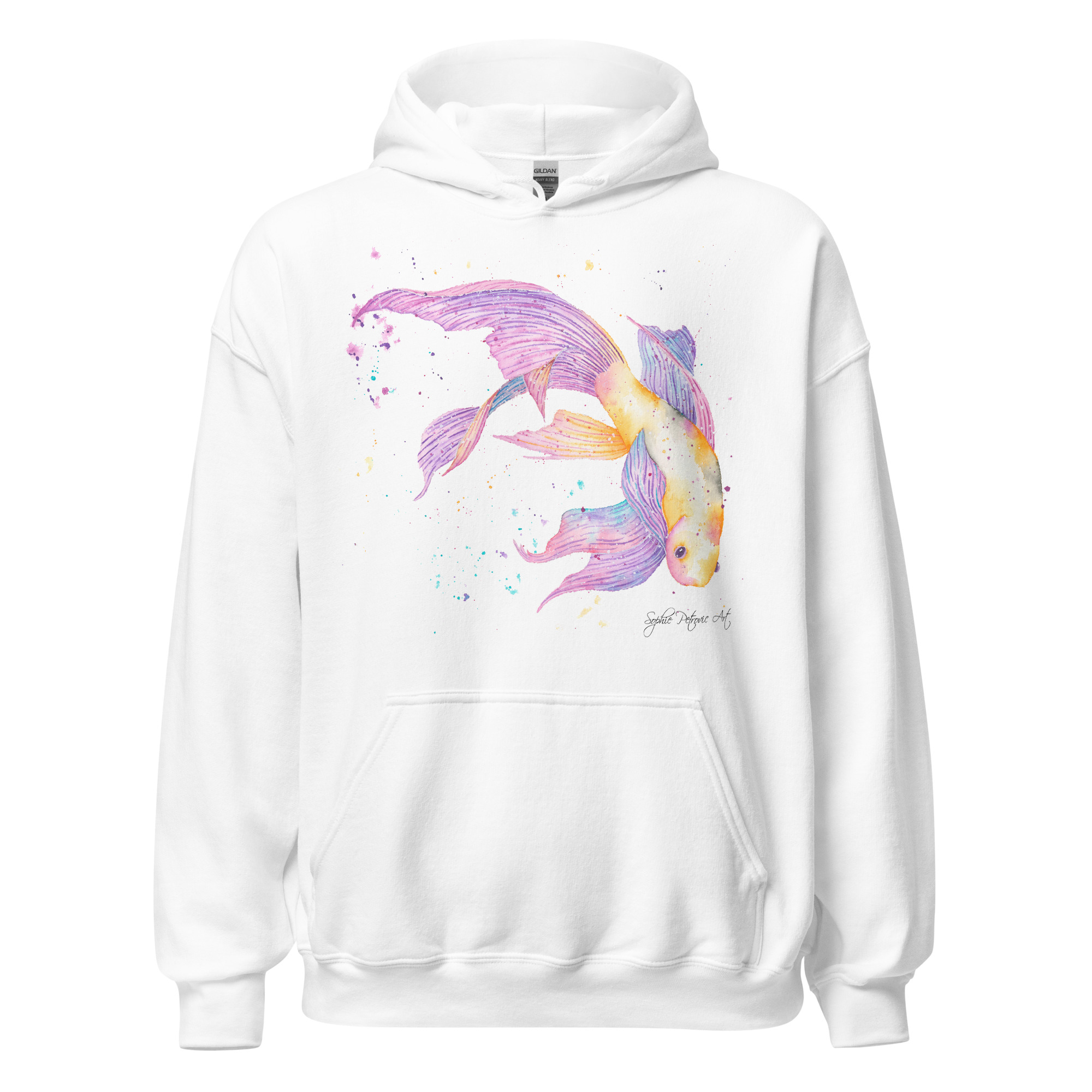 Adults' unisex koi fish hoodie featuring a watercolour design with a front pouch pocket by sophie petrovic artKoi Fish Hoodie