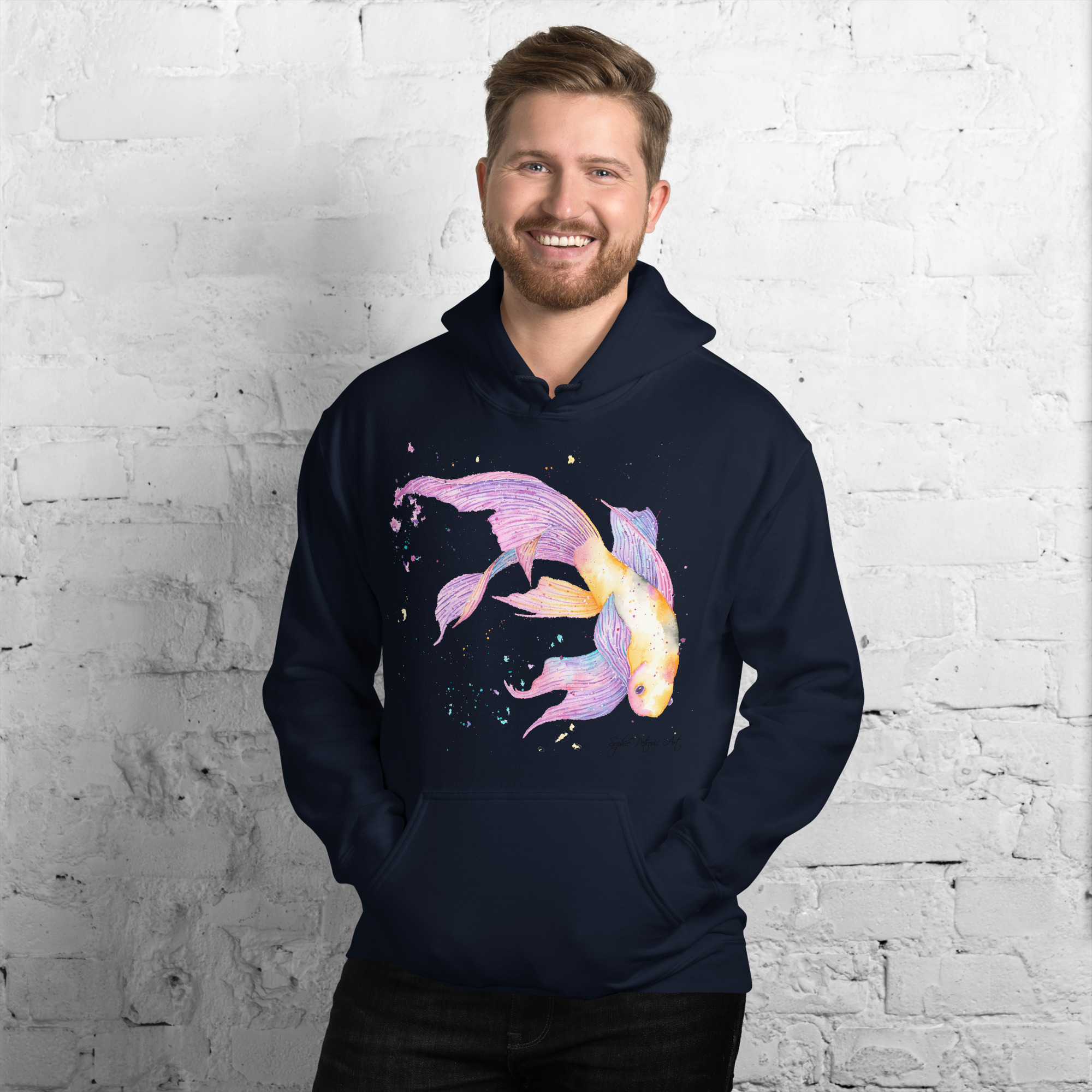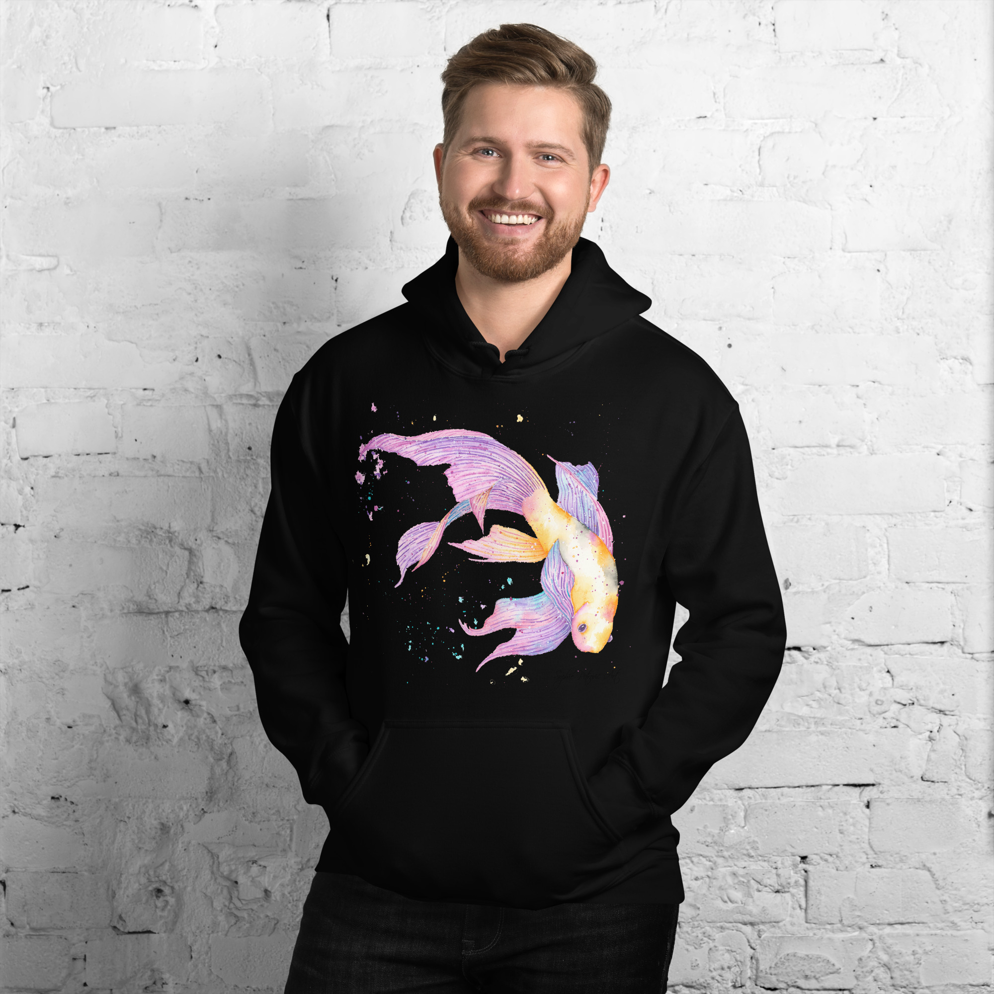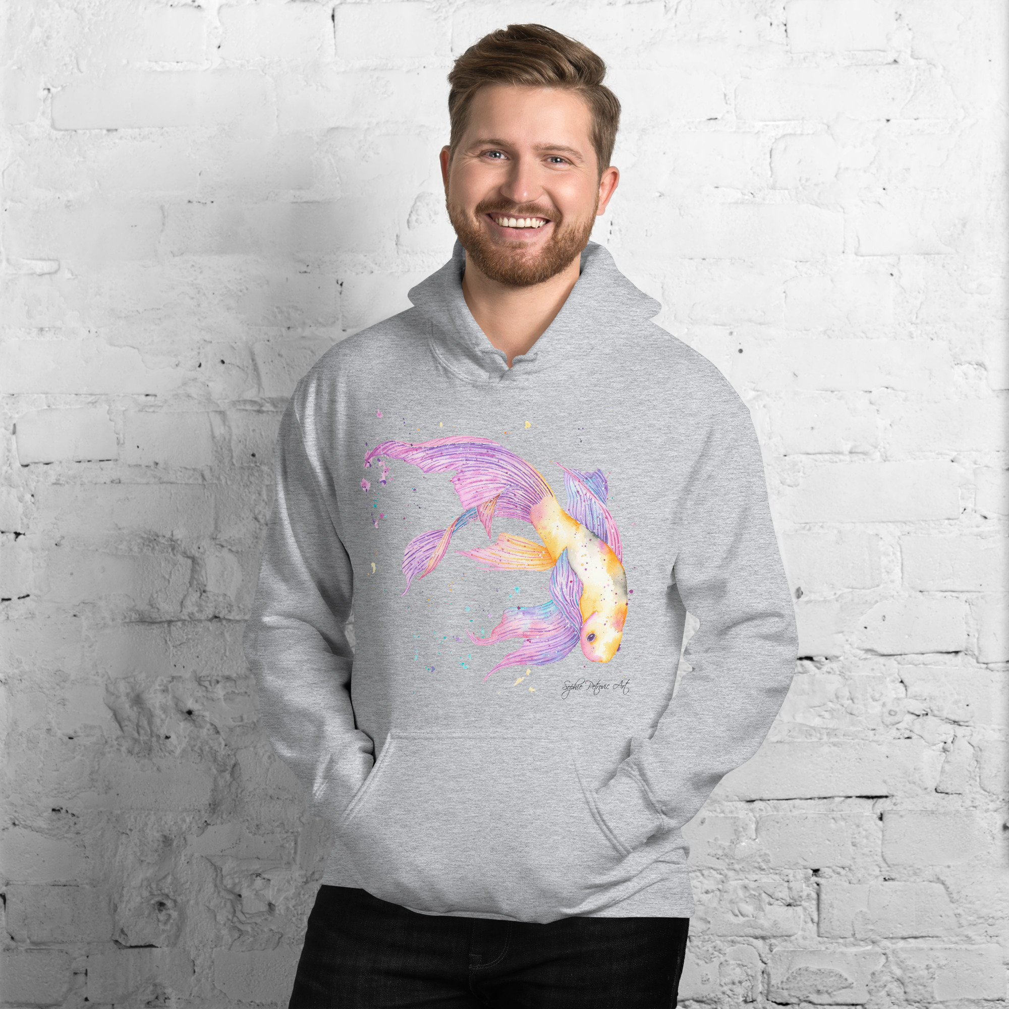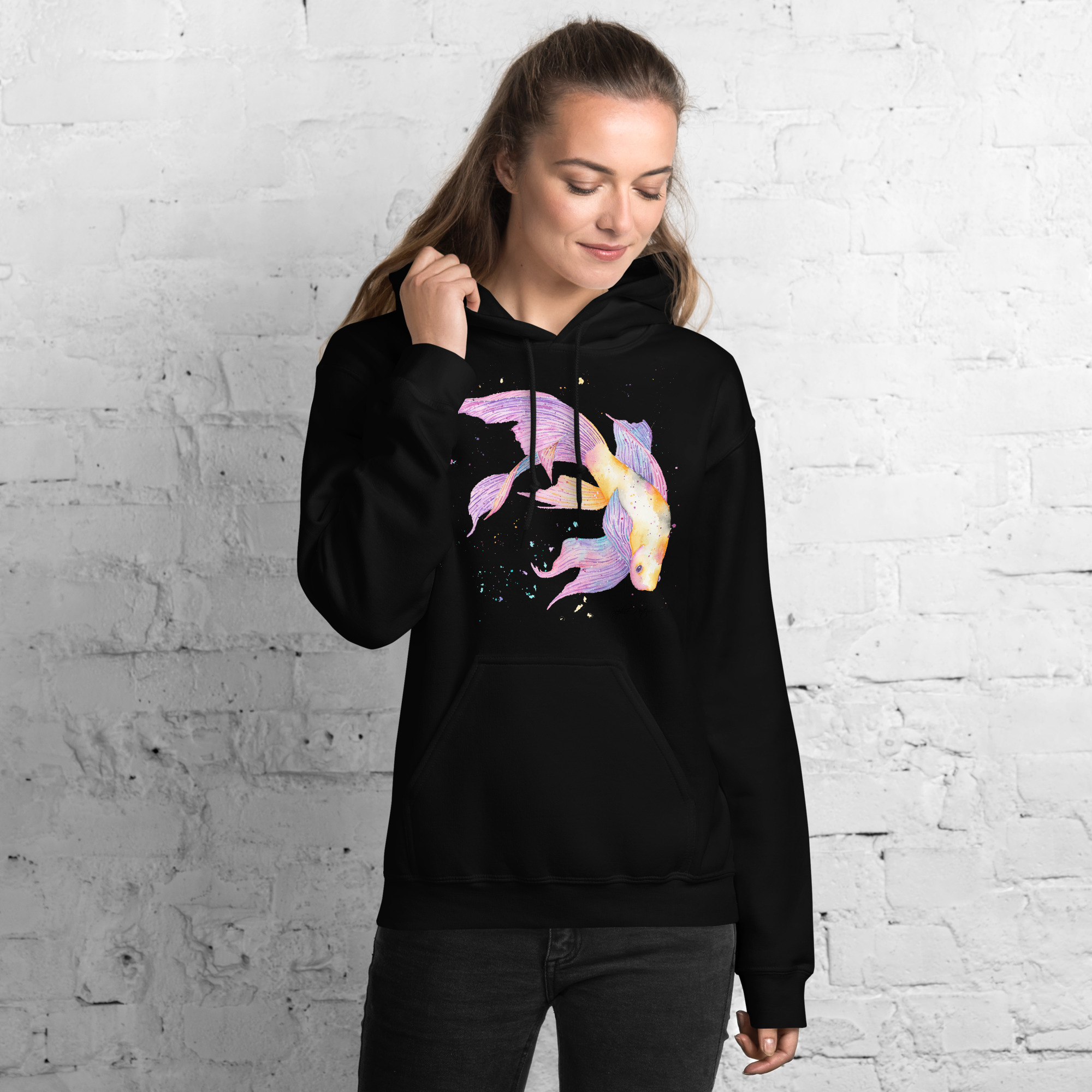 Adults' unisex koi fish hoodie featuring a watercolour design with a front pouch pocket by sophie petrovic artKoi Fish Hoodie