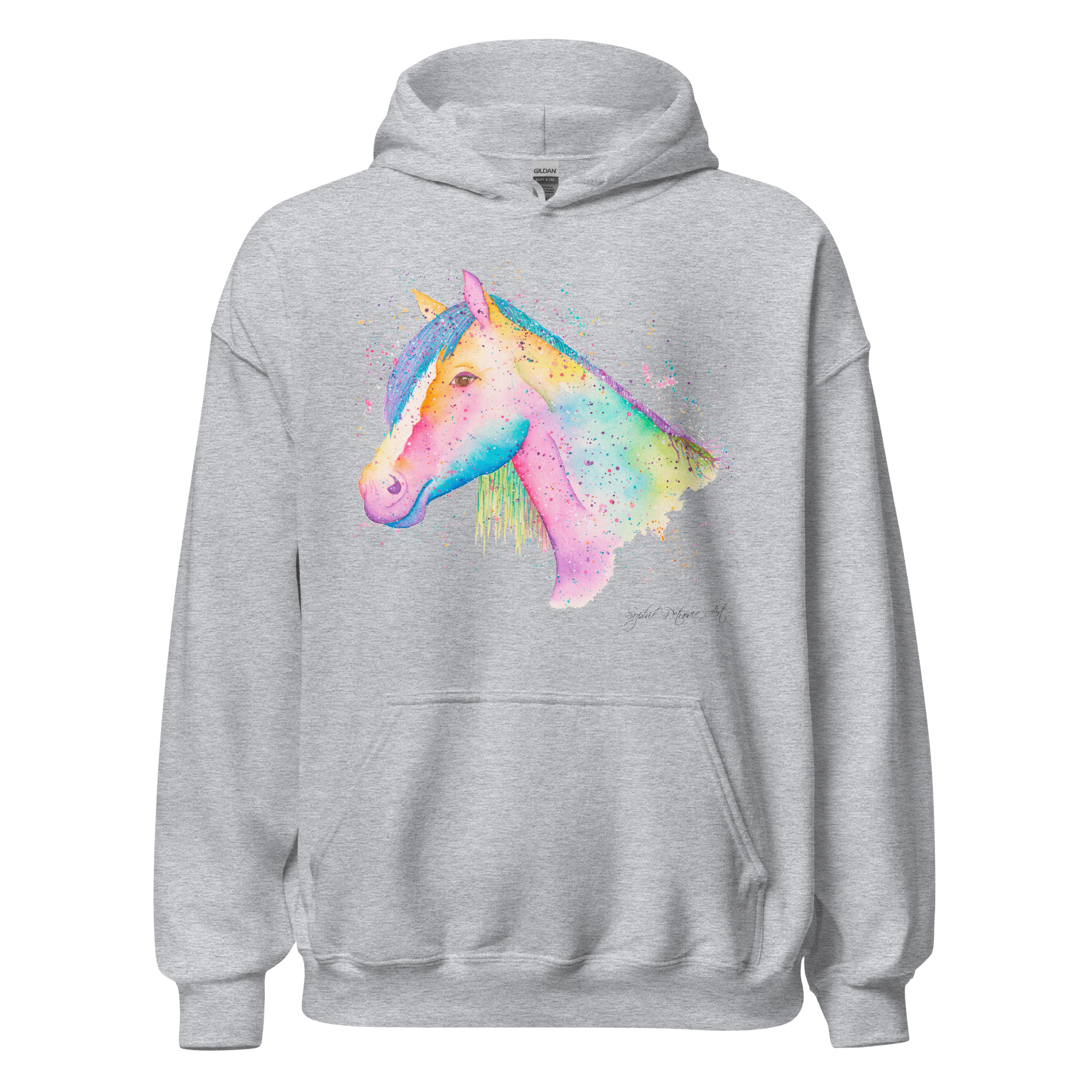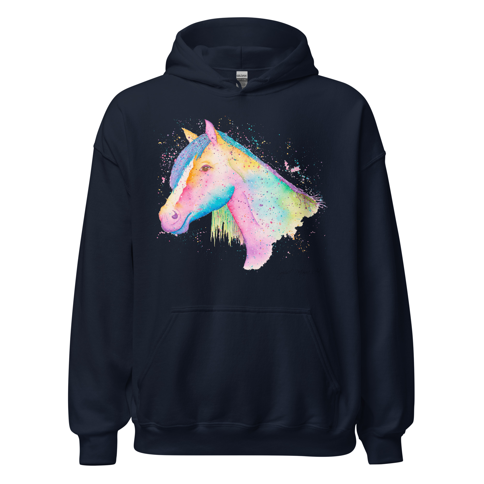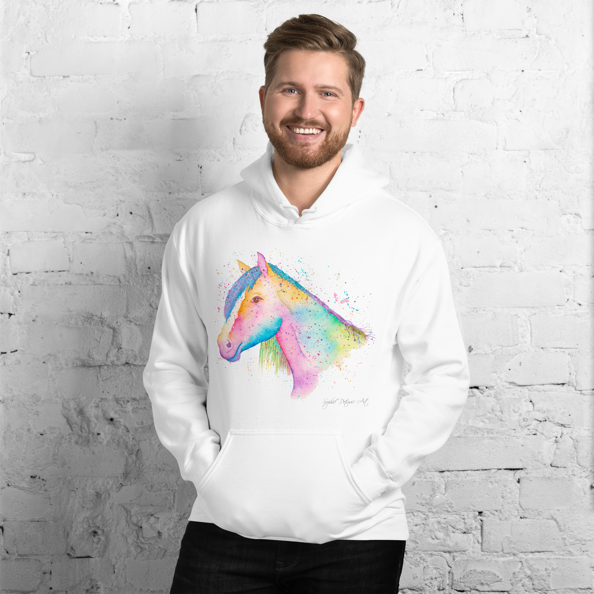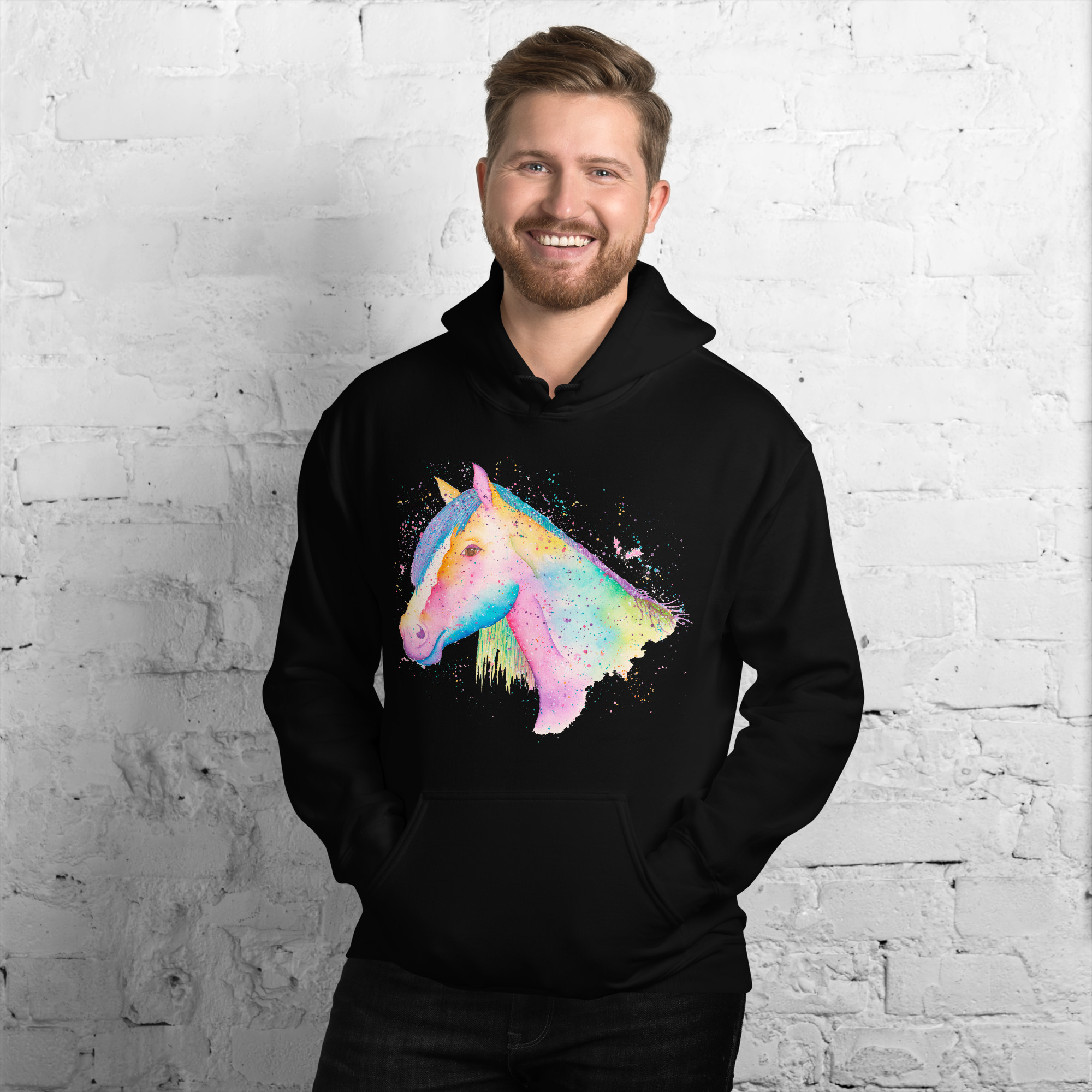 Everyone needs a cozy go to hoodie to curl up in, so go for one that’s soft, smooth, and stylish. Featuring Nikita The Horse from our watercolour collection, this hoodie brings a soft blend of natural grace and vibrant, colourful elegance to your wardrobe. It’s the perfect choice for cooler evenings, coastal walks, or simply relaxing at home.
