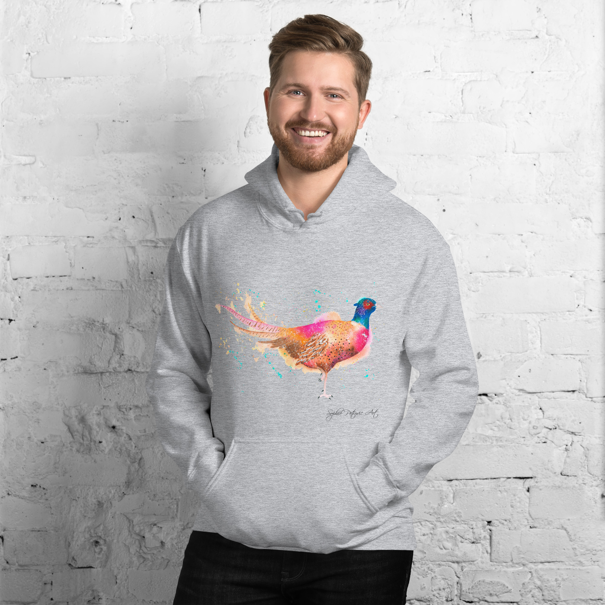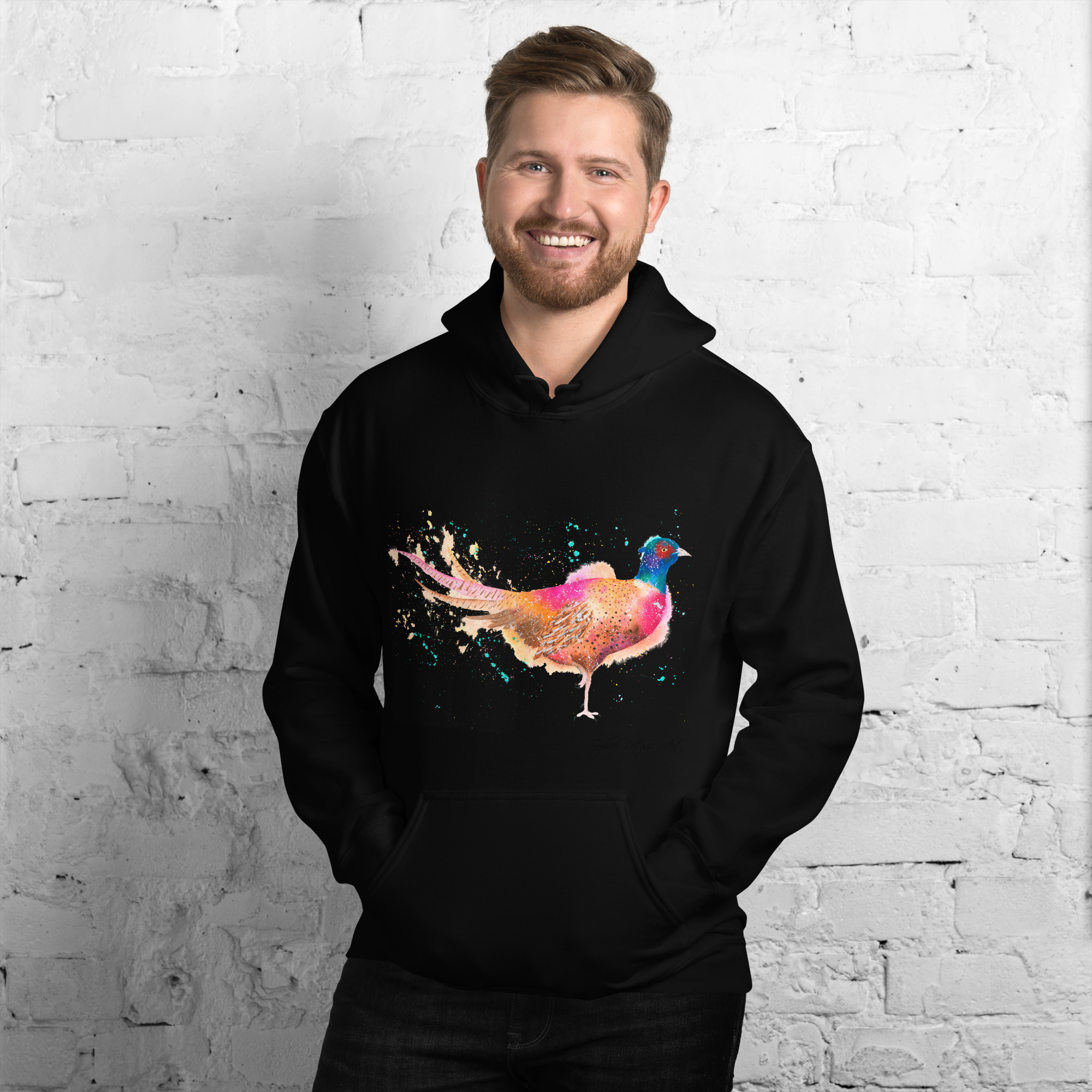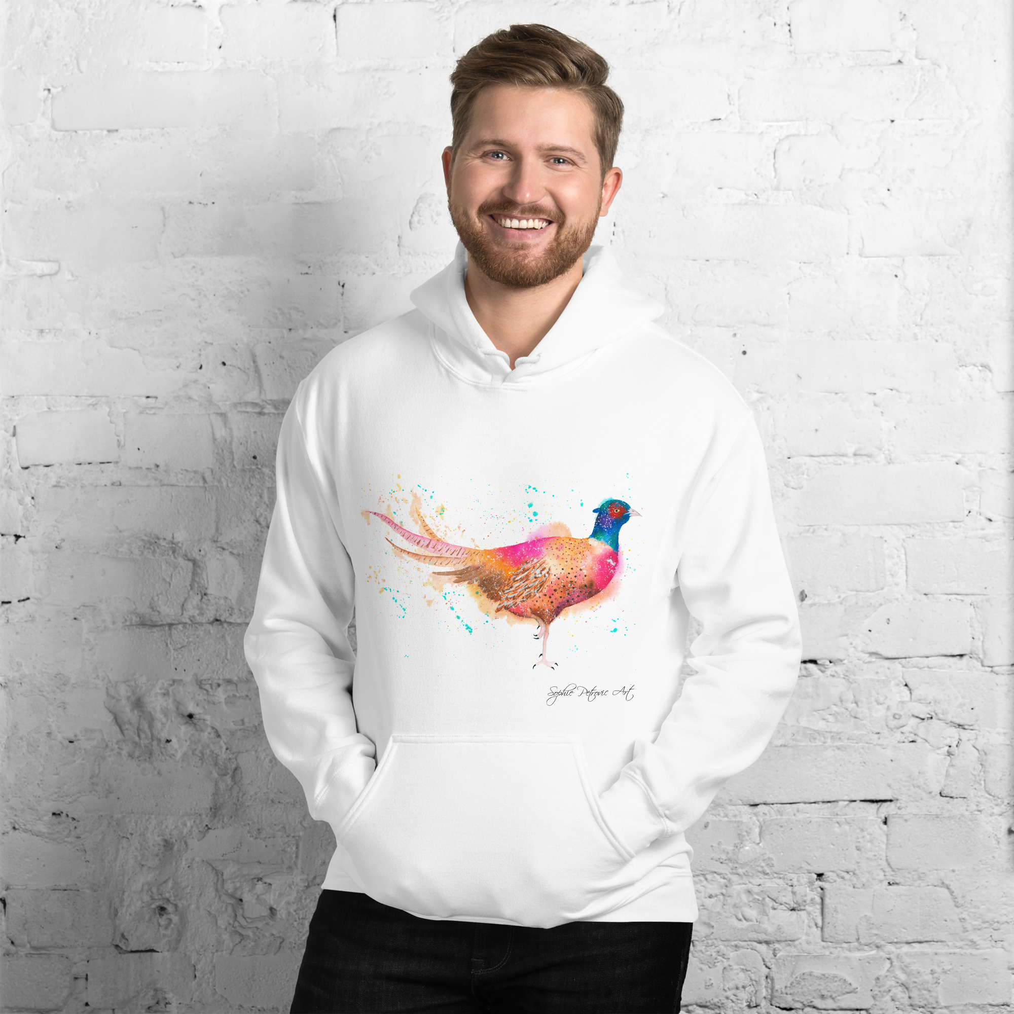 Everyone needs a cozy go to hoodie to curl up in, so go for one that’s soft, smooth, and stylish. Featuring Phil The Pheasant from our watercolour collection, this hoodie brings a soft blend of natural grace and vibrant, colourful elegance to your wardrobe. It’s the perfect choice for cooler evenings, coastal walks, or simply relaxing at home.
