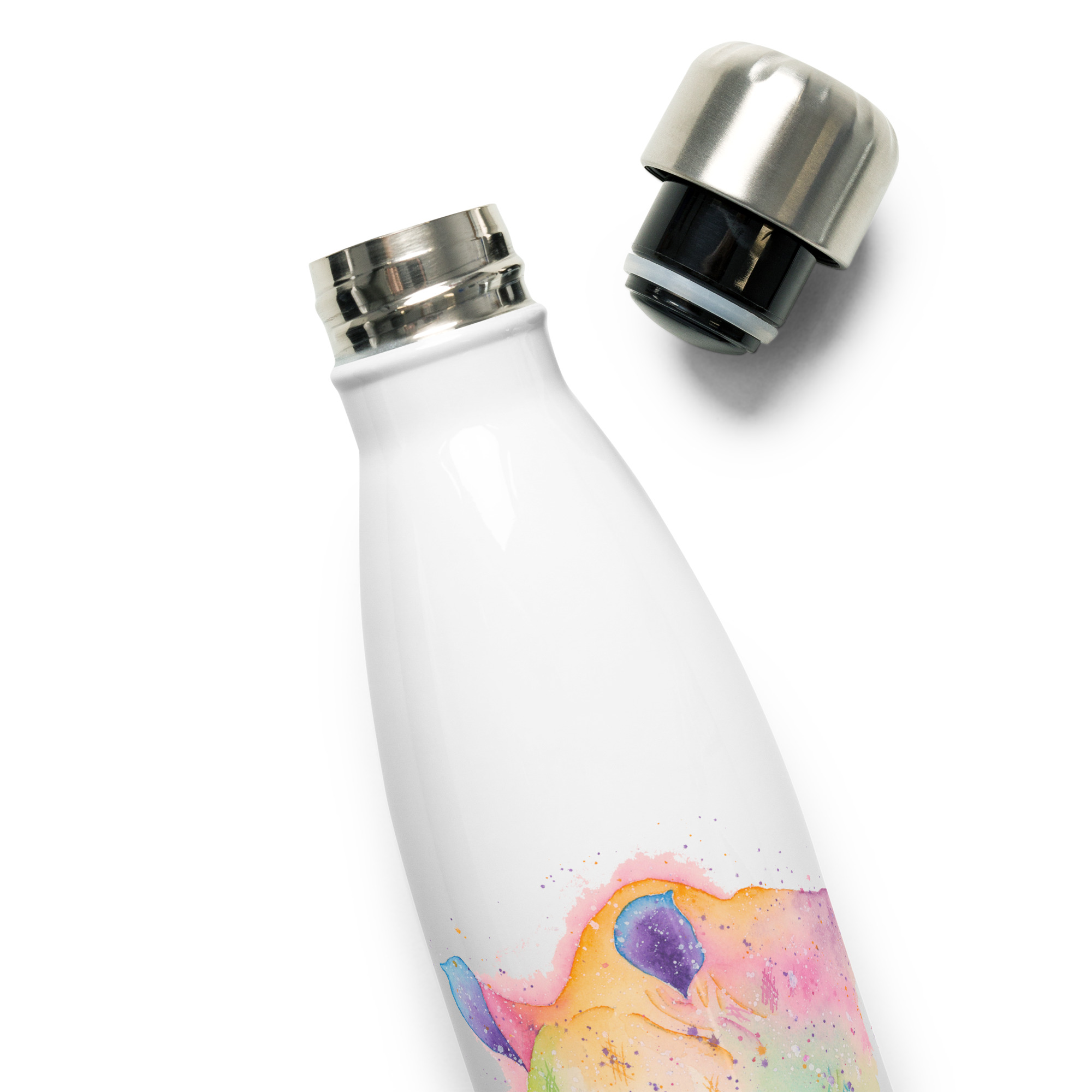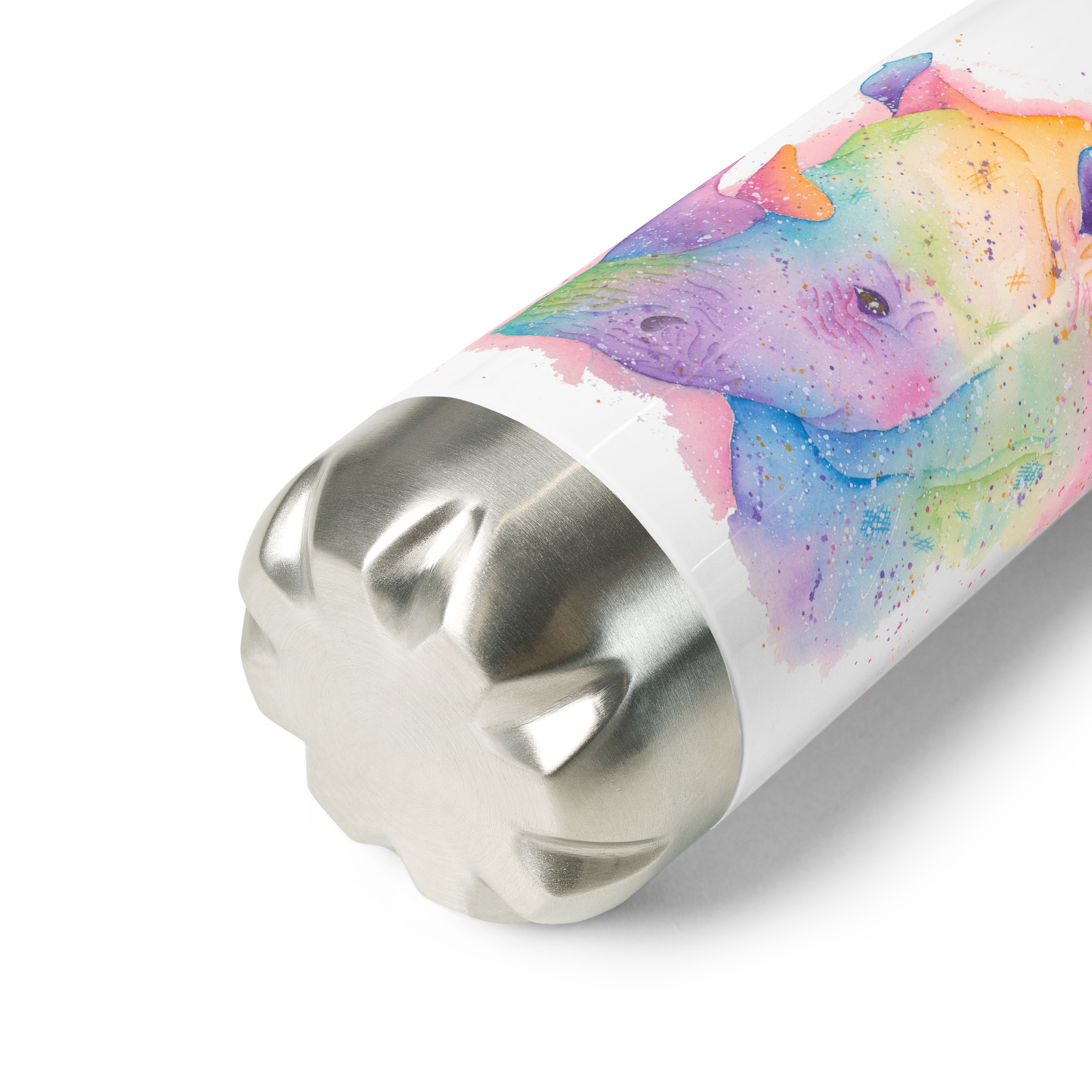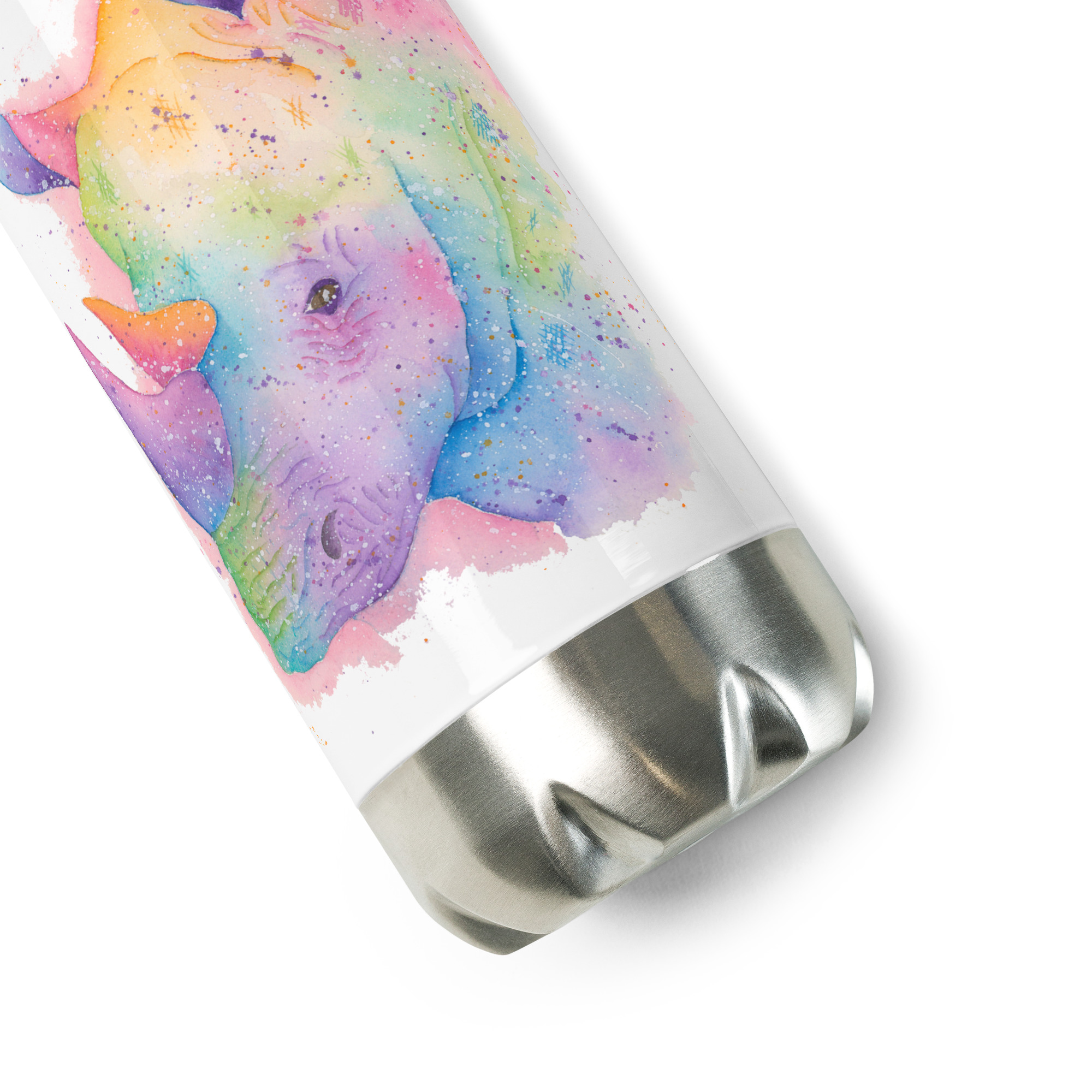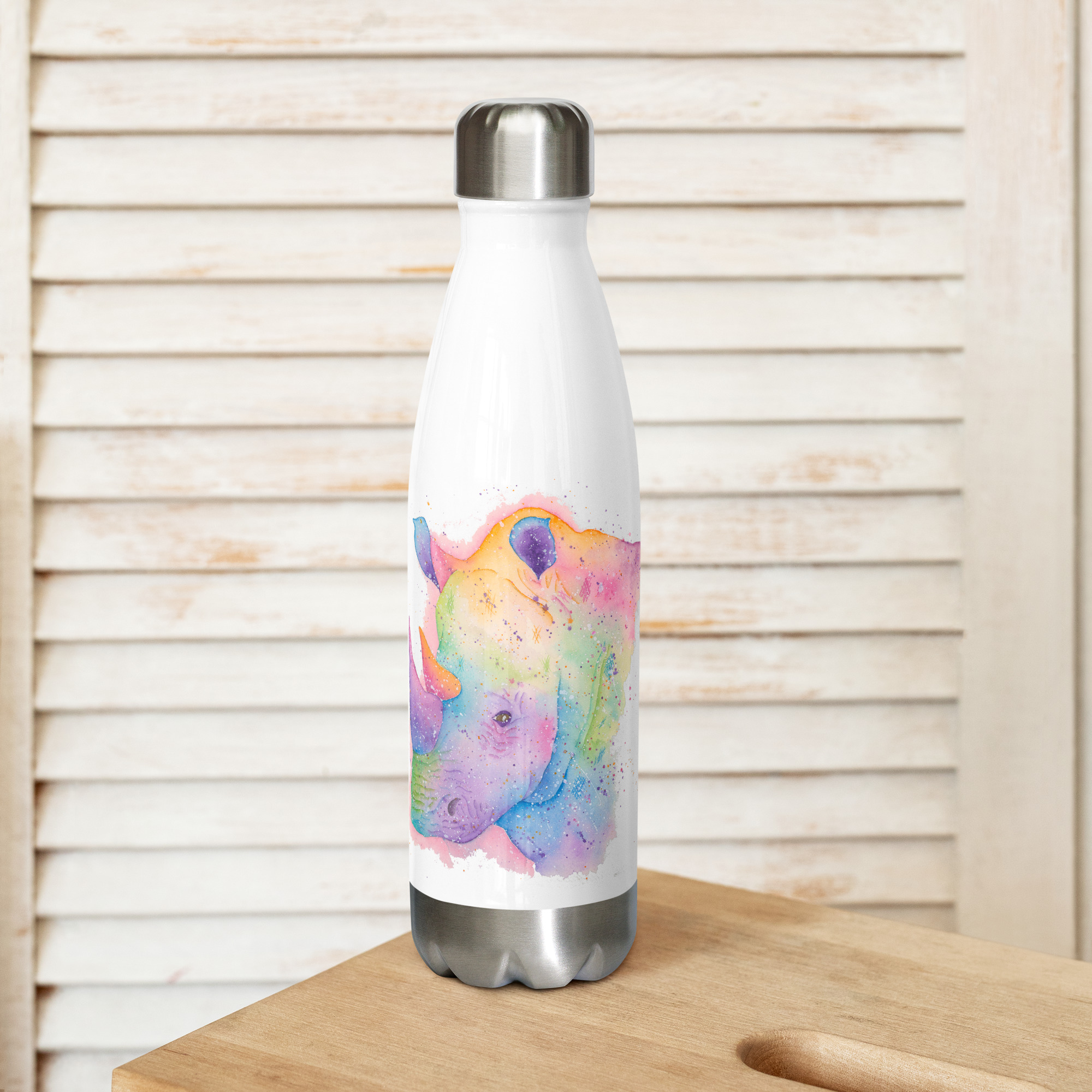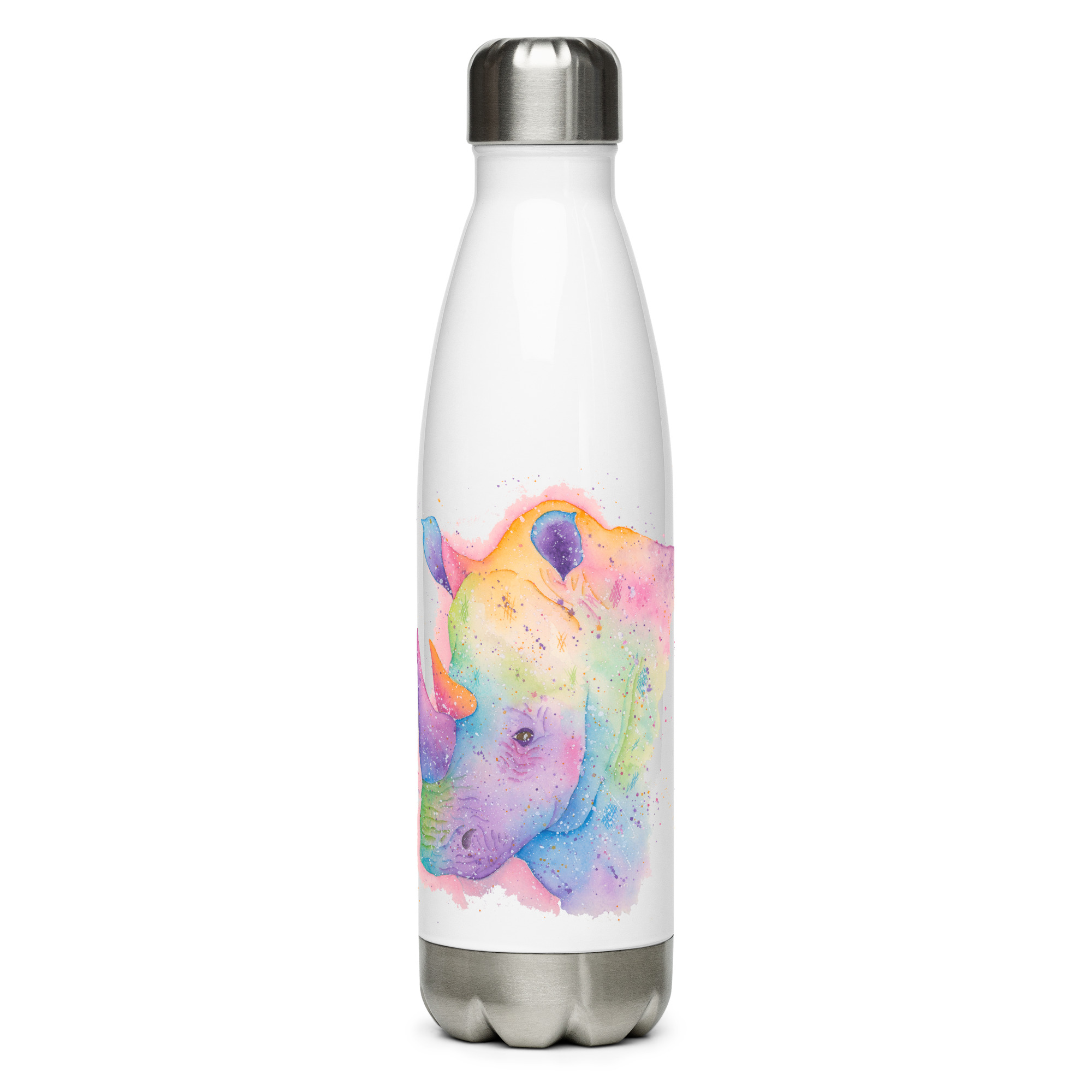 Powerful stainless steel water bottle featuring Rupert the Rhino, a hand-painted watercolour designRupert The Rhino water bottle