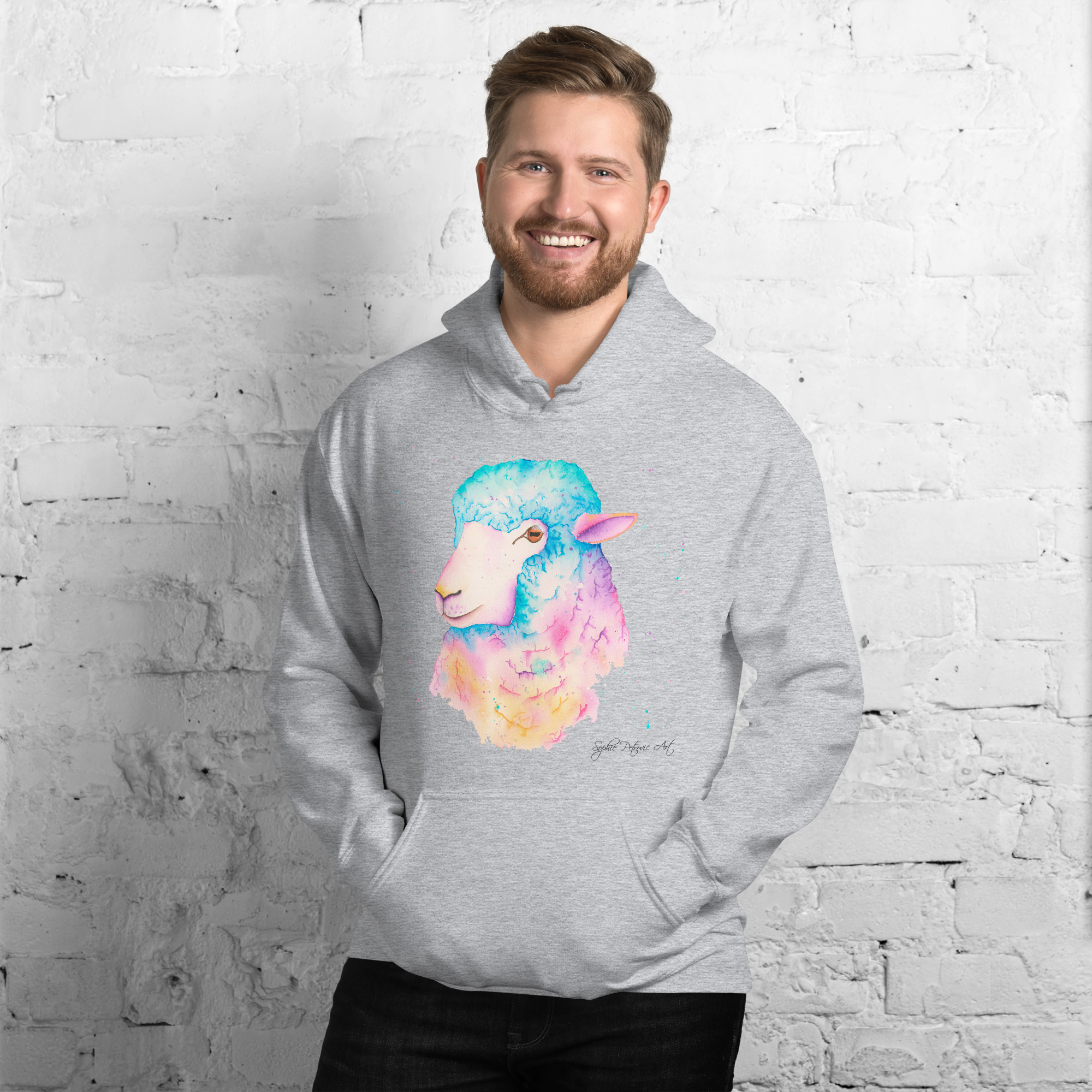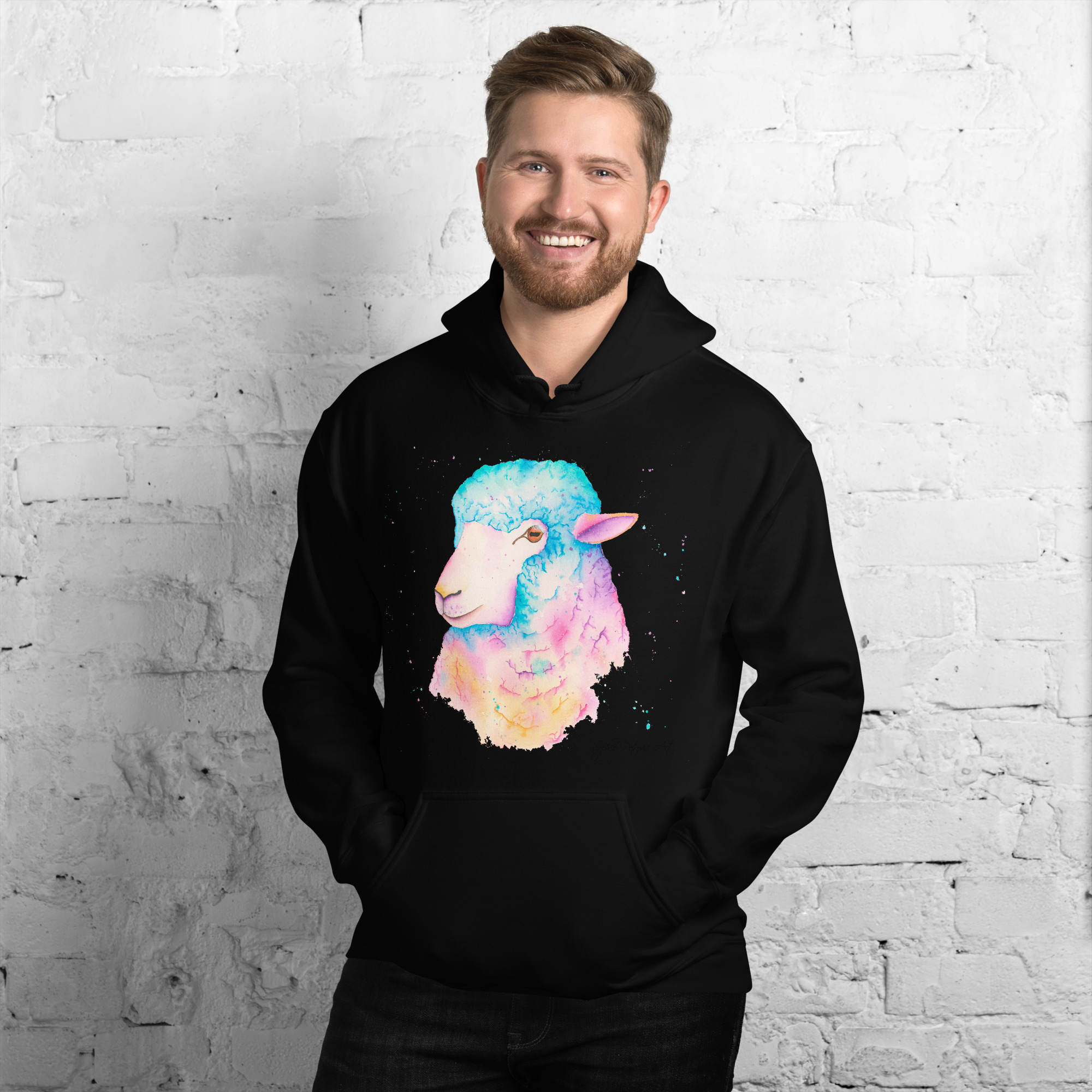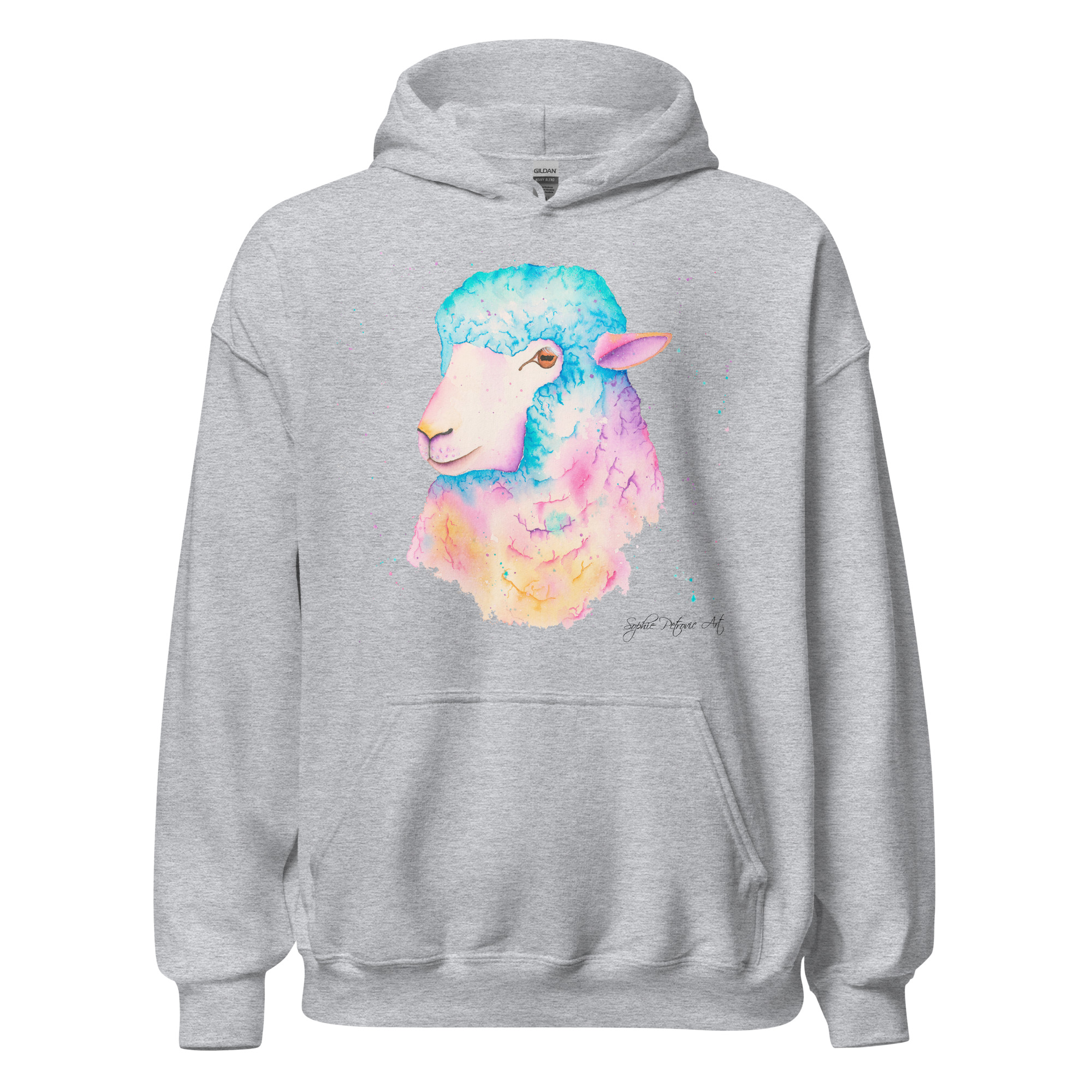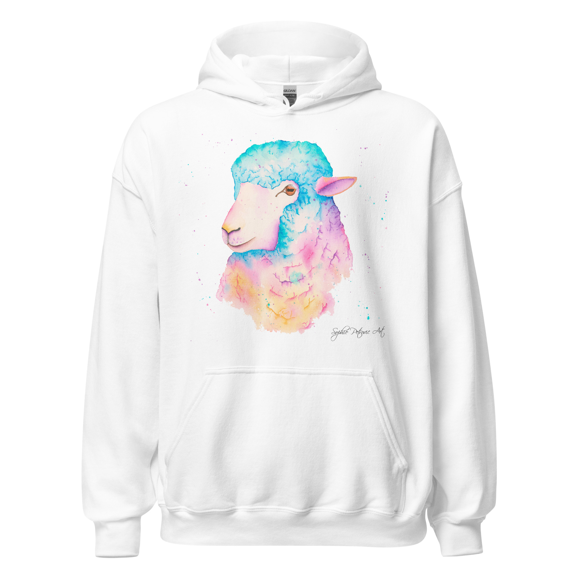 Adults' unisex sheep hoodie featuring Sarah the Sheep, a vibrant watercolour design with a front pouch pocket. by sophie petrovicSarah The Sheep Hoodie