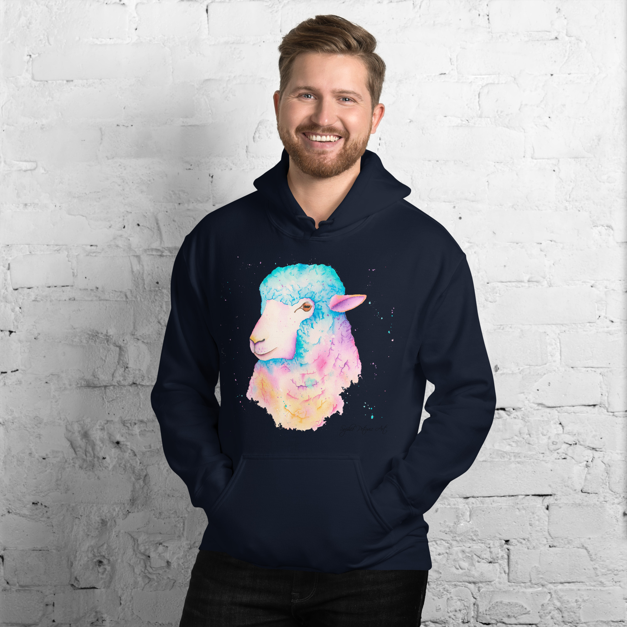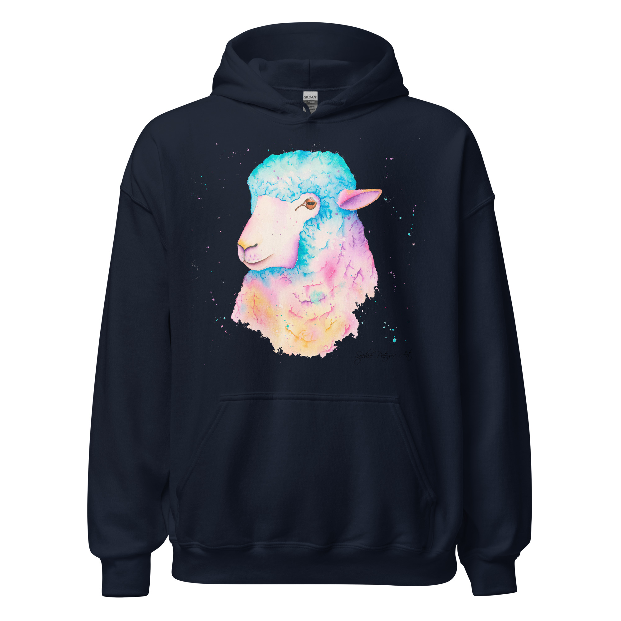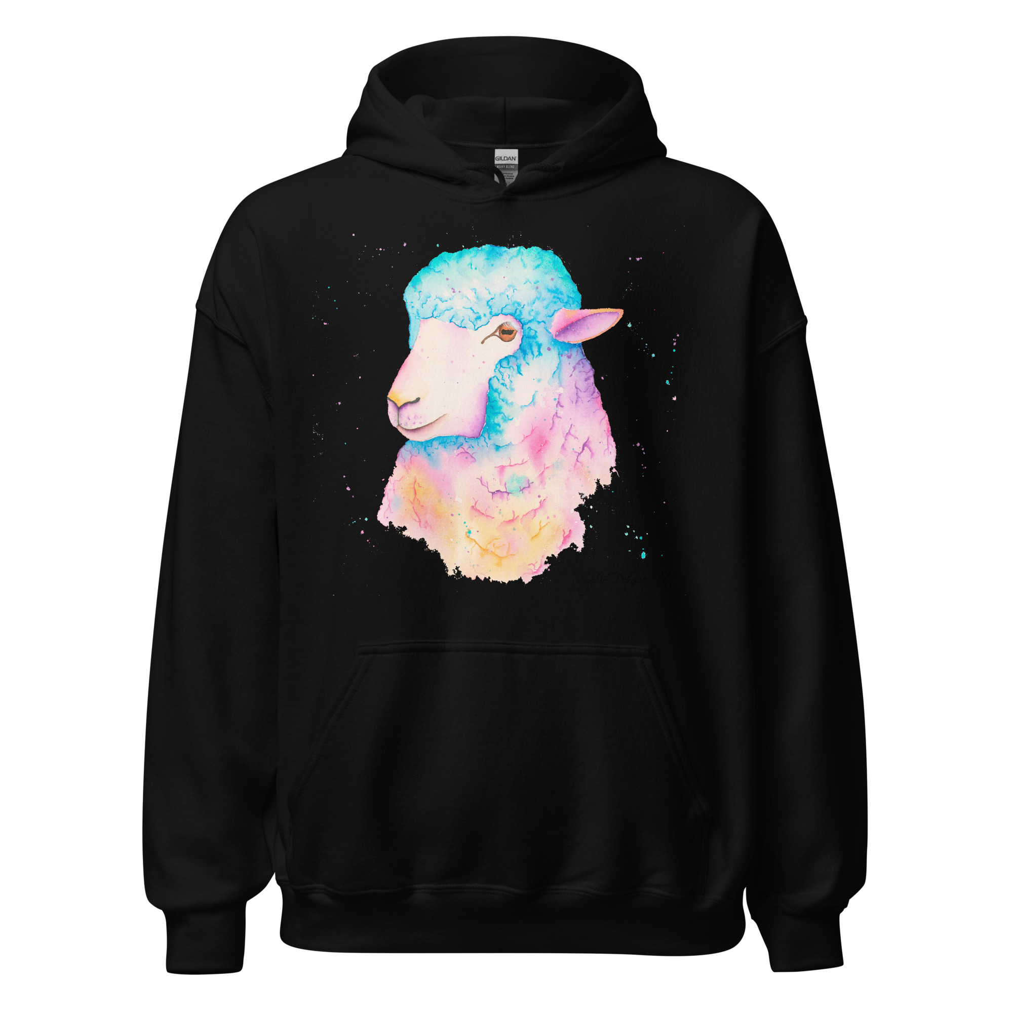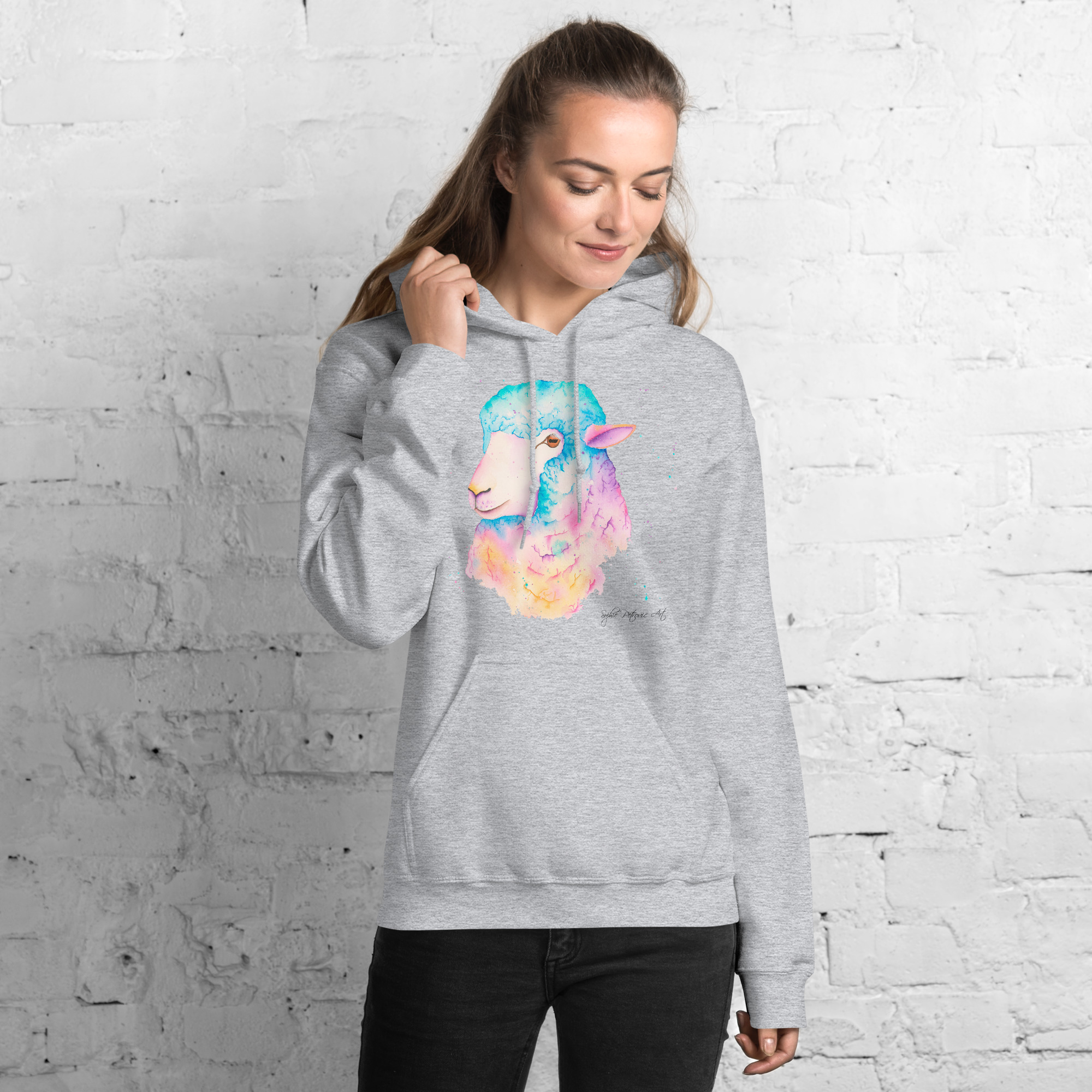 Adults' unisex sheep hoodie featuring Sarah the Sheep, a vibrant watercolour design with a front pouch pocket. by sophie petrovicSarah The Sheep Hoodie