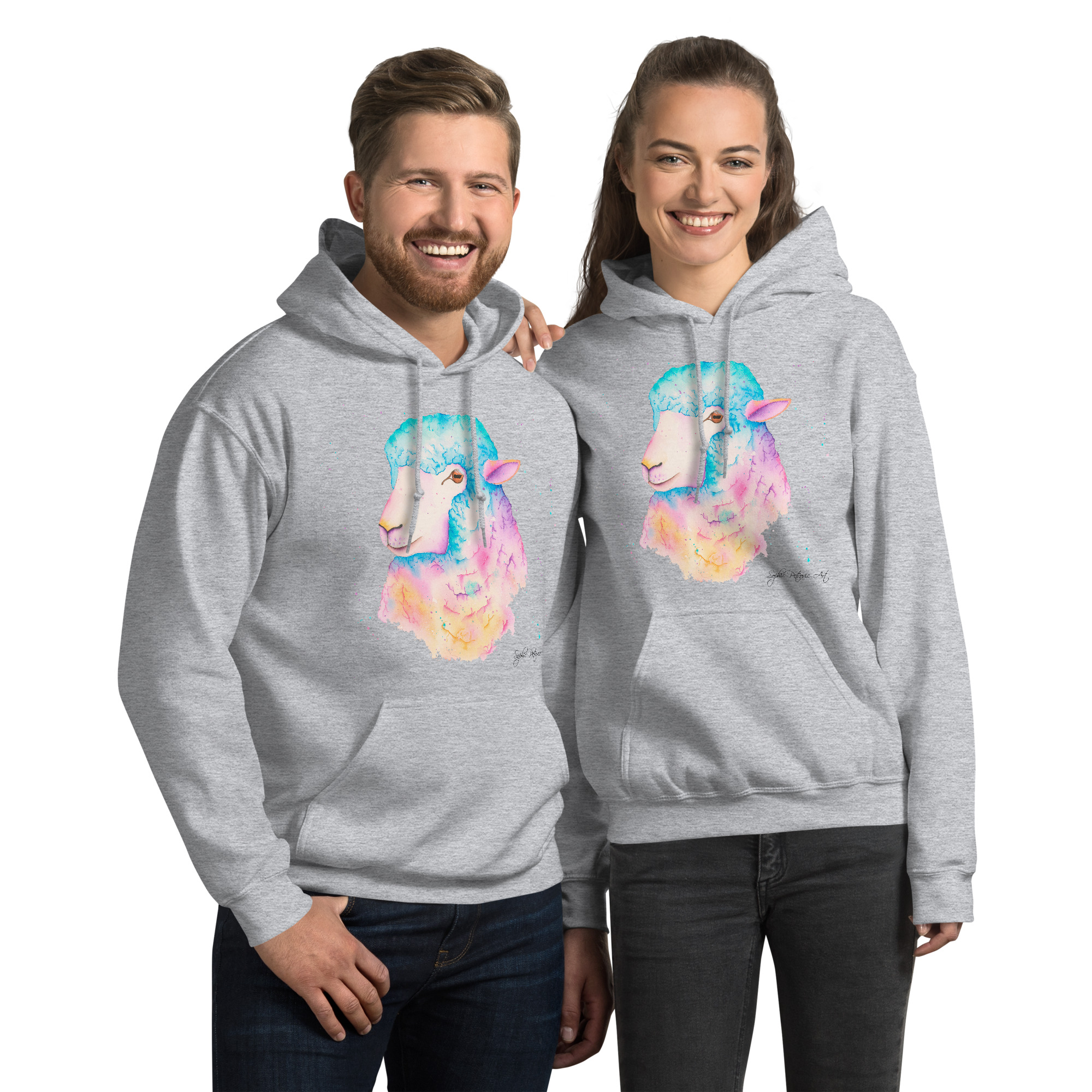 Everyone needs a cozy go to hoodie to curl up in, so go for one that’s soft, smooth, and stylish. Featuring Sarah The Sheep from our watercolour collection, this hoodie brings a soft blend of natural grace and vibrant, colourful elegance to your wardrobe. It’s the perfect choice for cooler evenings, coastal walks, or simply relaxing at home.