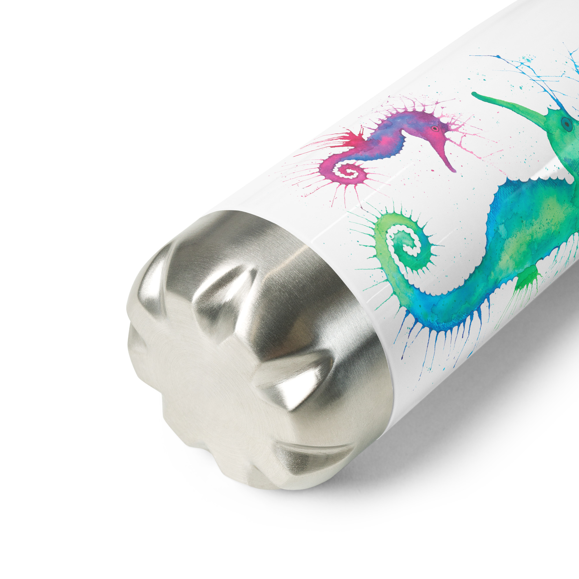Elegant stainless steel drinks bottle featuring a pair of watercolour seahorsesSeahorses water bottle