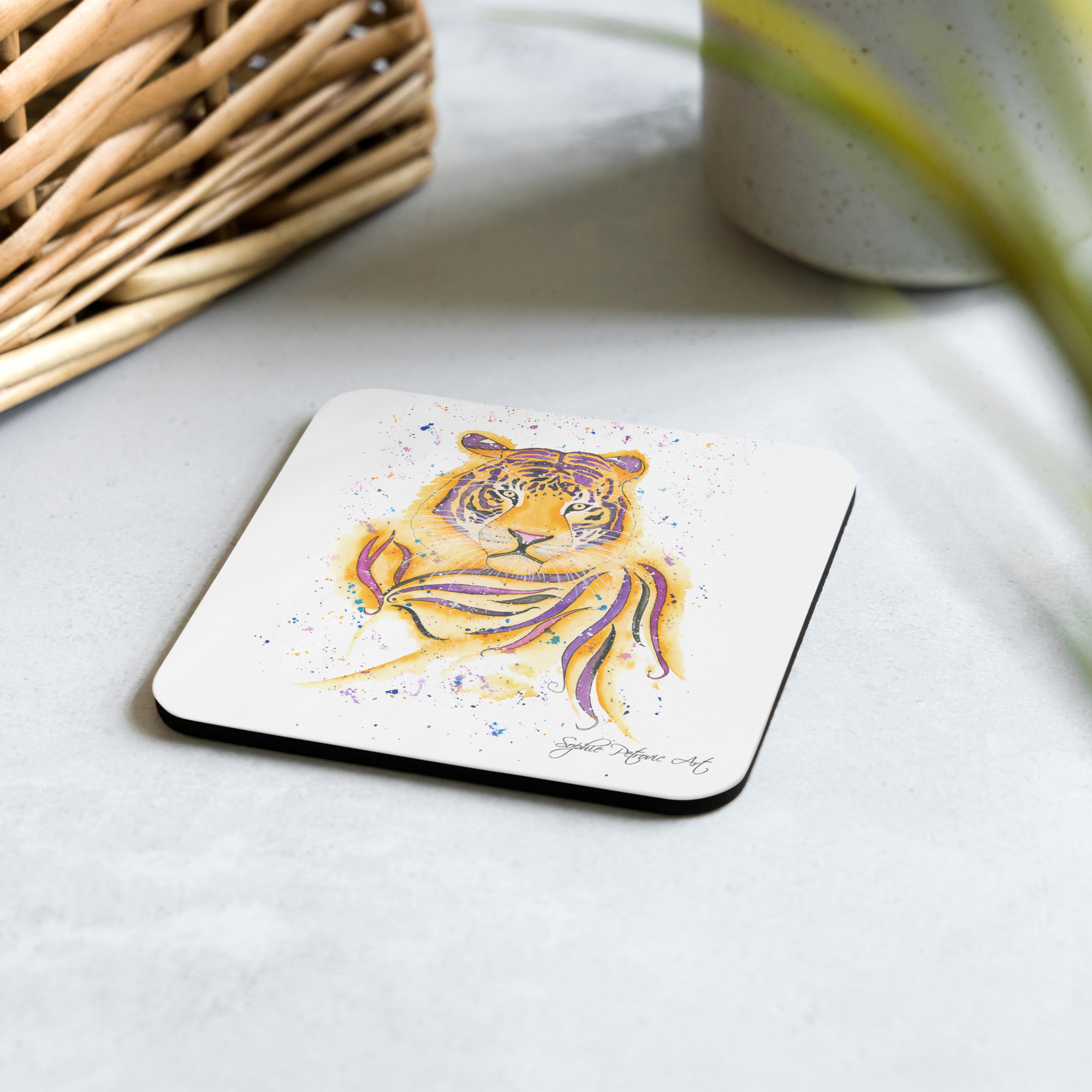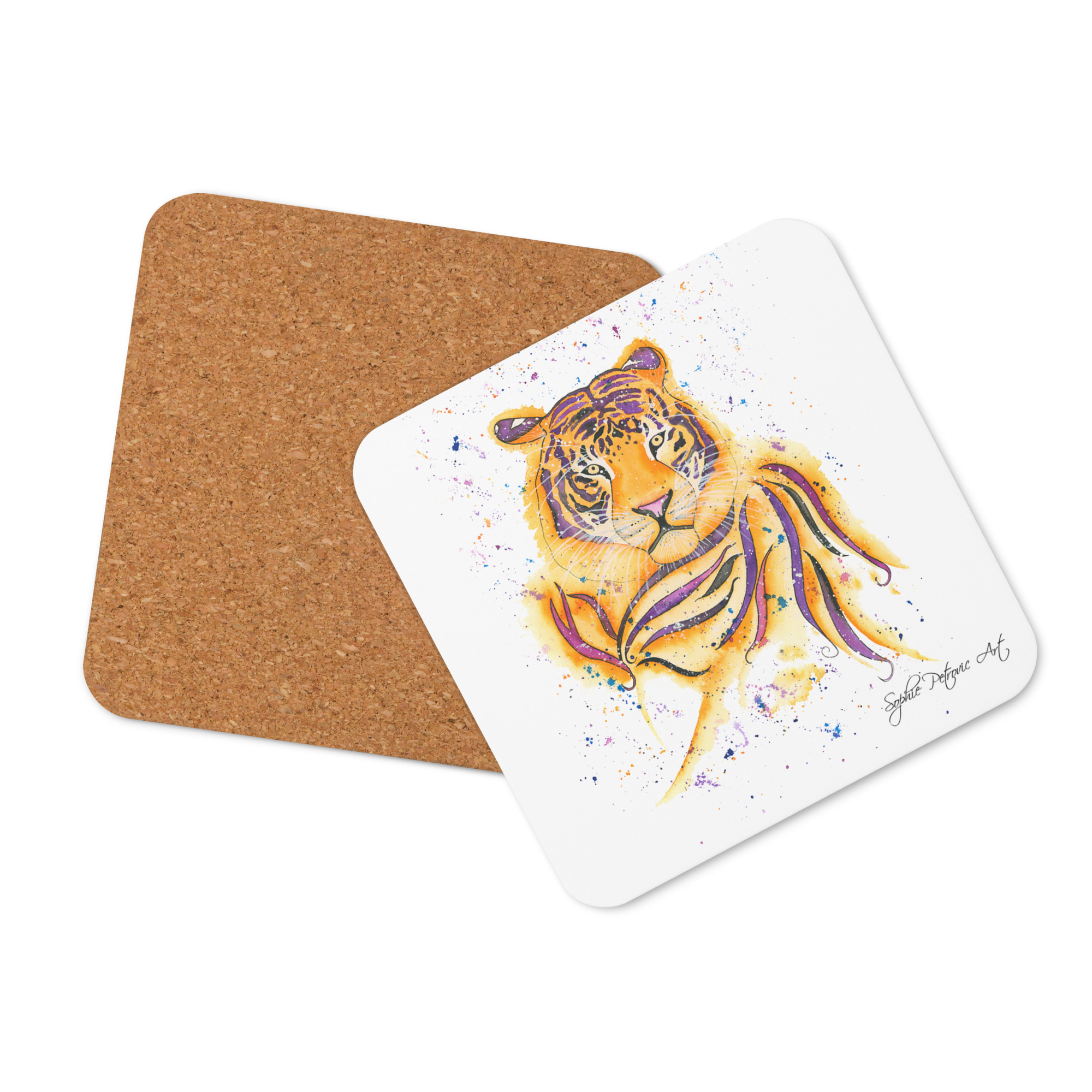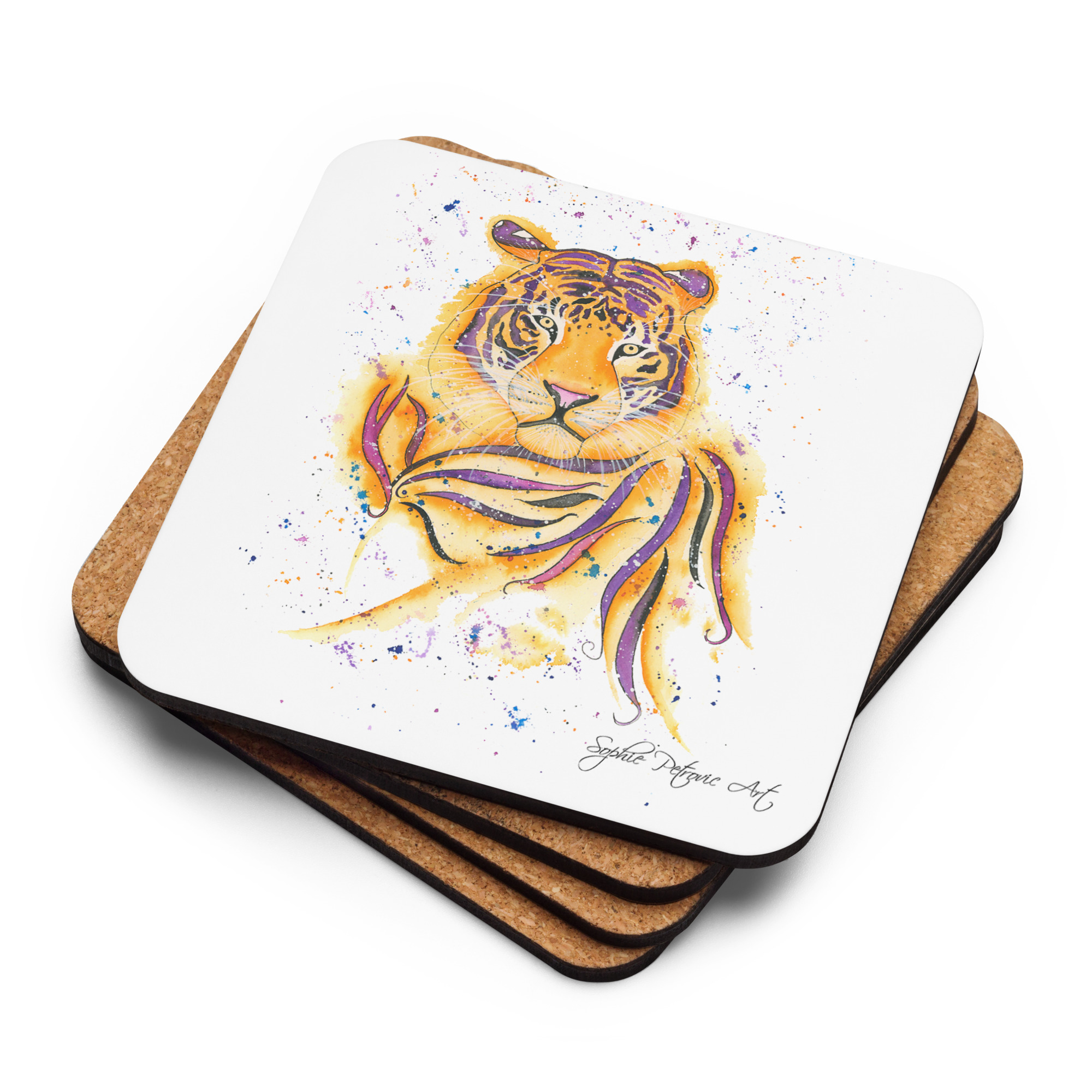 Crafted to be both practical and beautiful, our coasters feature a high-quality, heat-resistant surface and a sturdy backing to keep your furniture safe from spills and rings. The stunning watercolour detail captures his piercing gaze and iconic orange-and-black stripes, making it a standout piece of functional art for any coffee table, desk, or bedside stand.